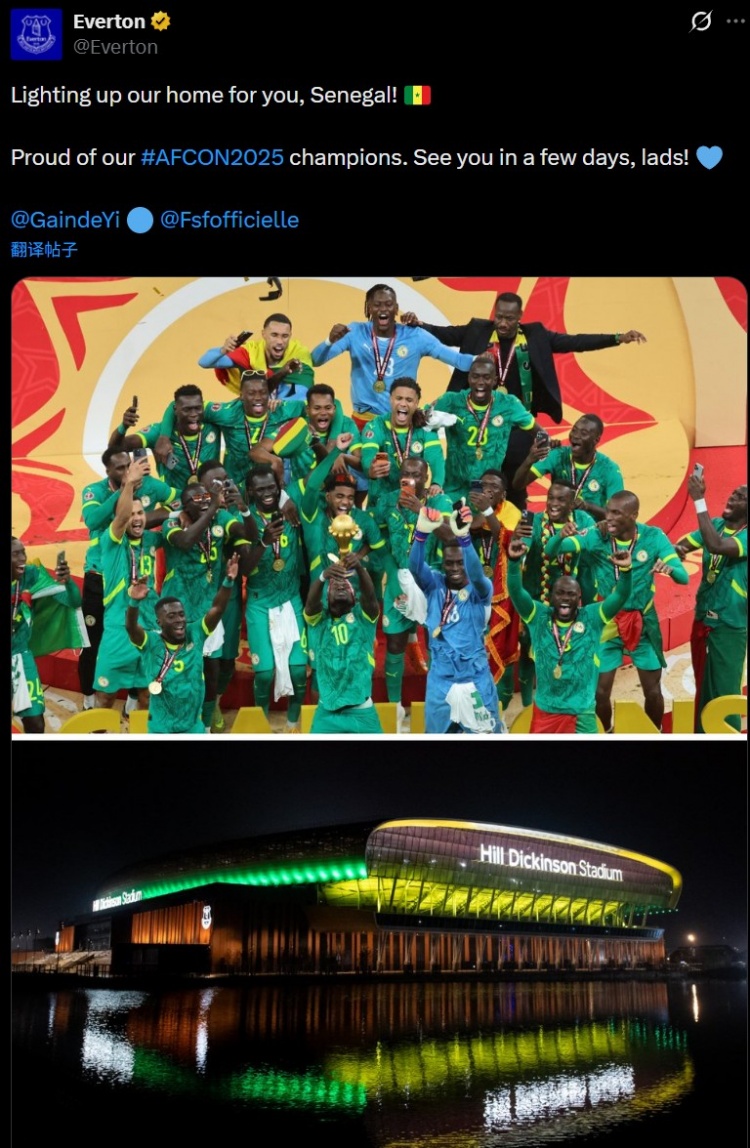 埃弗顿社媒也晒出主场呈现塞内加尔国旗配色的灯光秀,并送上祝贺:“塞内加尔,我们为你而点亮家园!为我们的非洲杯冠军们感到骄傲!几天后见,伙计们!”