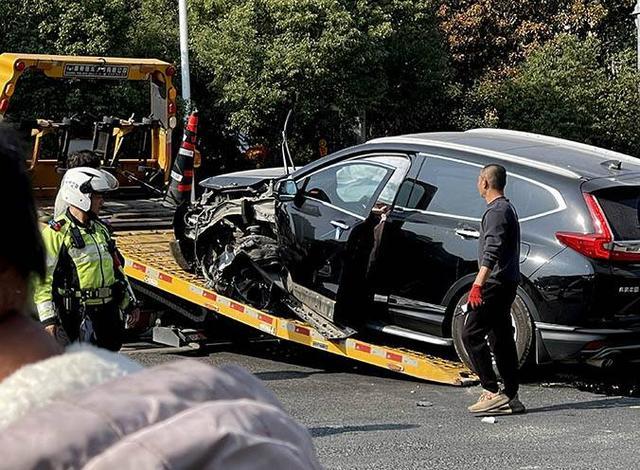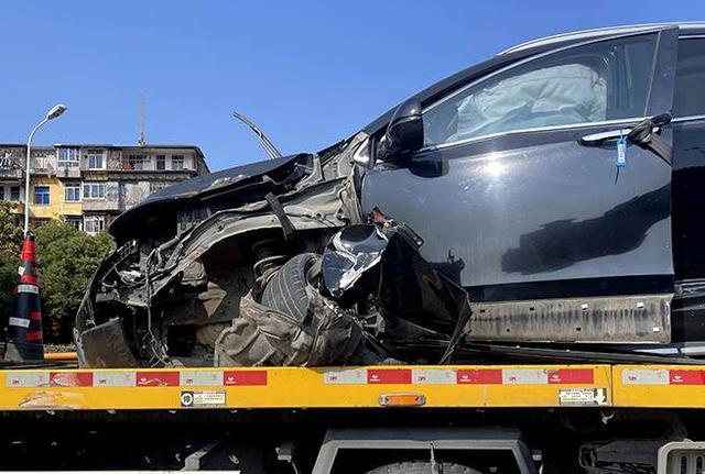记者赶到现场看到,事故发生在沁园路与沁河路交界处、沁河路南往北方向路段。涉事黑色SUV横在路中间,一辆黄色拖车正待命准备将其拖离。事故车损毁严重,左前侧面目全非,左前轮撞断轴后歪向一侧,驾驶室内安全气囊已全部弹出,左前侧车门无法闭合,仅靠一根绳子捆绑固定。