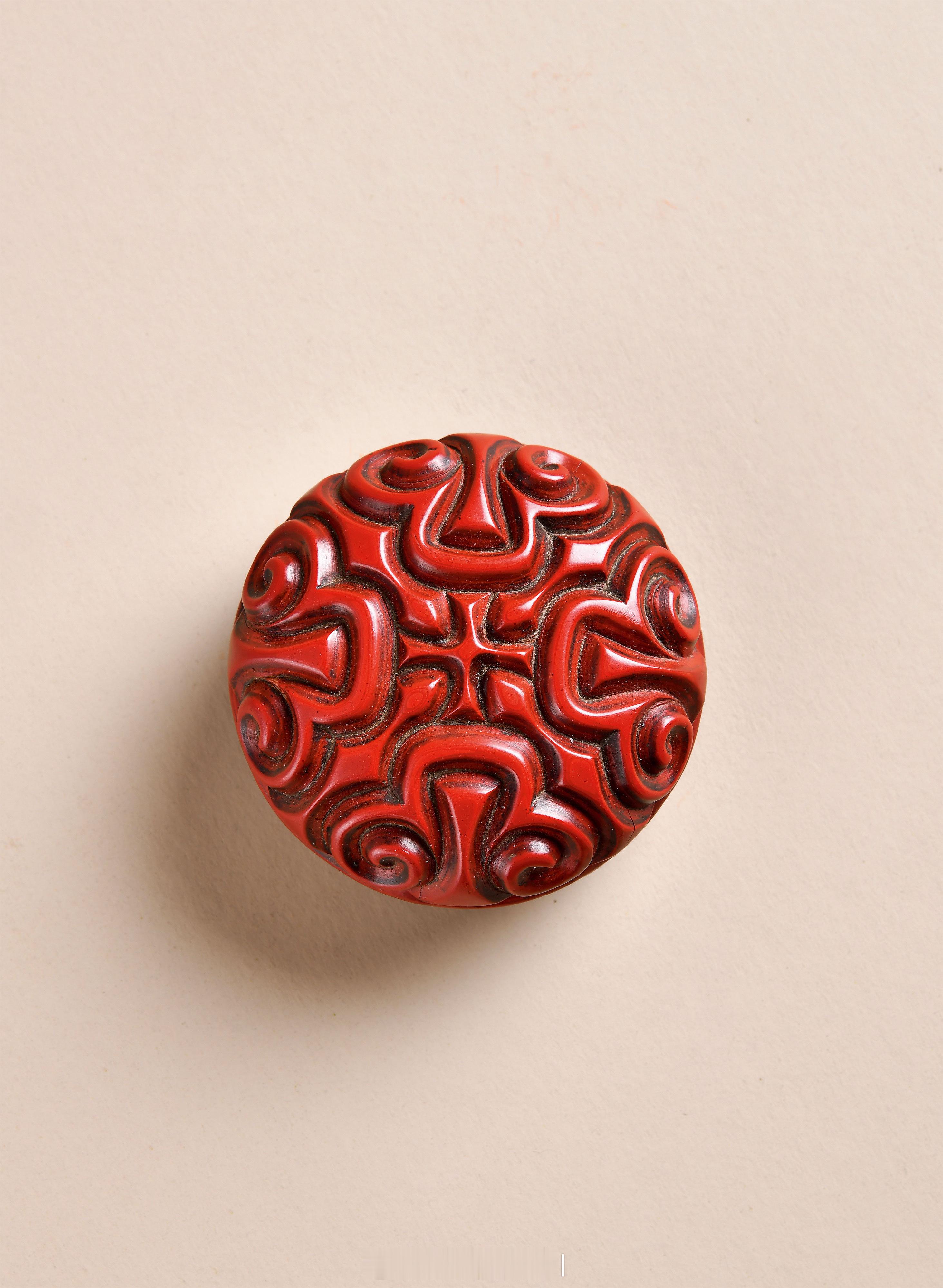 髹饰录 | 明 剔犀如意云头纹香盒器呈圆形,子母口相扣合,内挖圈足。盒内及底髤黑漆,外部剔犀,双面满工,盖面中心雕柿蒂纹,外缘及器底各雕四枚如意云头纹,在朱红峻深的刀口断面露出黑漆数道,此为《髹饰录》中记载的“红间黑带”,漆层与犀牛角横断面层层环绕的肌理效果极其相似,故而得名“剔犀”。整器器型利落大方,纹饰饱满,极具立体感,可见髹漆肥厚,线条灵动流畅,张力十足,漆质细腻,触手圆滑,可鉴磨工上佳,当为案头赏玩佳器。参阅:北京故宫博物院藏,文物号故00108266,剔犀如意云纹圆盒。尺寸:直径5.9cm;高3cm来源:北京博美2025年春季拍卖会《乾坤髹饰》 — 古代漆器专场