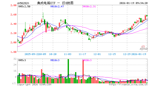 1月19日,集成电路ETF(562820)开盘涨0.19%,报2.577元。集成电路ETF(562820)重仓股方面,寒武纪开盘跌0.14%,中芯国际涨0.05%,海光信息涨0.68%,澜起科技跌0.76%,兆易创新涨0.05%,豪威集团涨0.00%,芯原股份涨0.00%,长电科技涨1.59%,紫光国微跌1.20%,通富微电涨1.37%。