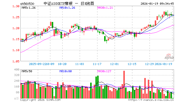 1月19日,中证A500ETF摩根(560530)开盘涨0.00%,报1.256元。中证A500ETF摩根(560530)重仓股方面,宁德时代开盘跌0.24%,贵州茅台跌0.01%,中国平安跌0.08%,招商银行涨0.03%,紫金矿业涨0.40%,新易盛跌1.25%,中际旭创跌1.94%,美的集团涨0.08%,东方财富跌0.38%,长江电力涨0.34%。