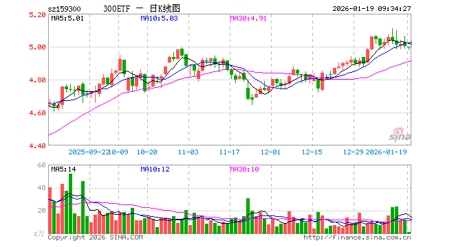 1月19日,300ETF(159300)开盘跌0.04%,报5.000元。300ETF(159300)重仓股方面,宁德时代开盘跌0.24%,贵州茅台跌0.01%,中国平安跌0.08%,招商银行涨0.03%,紫金矿业涨0.40%,新易盛跌1.25%,中际旭创跌1.94%,美的集团涨0.08%,东方财富跌0.38%,长江电力涨0.34%。