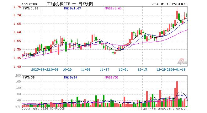 1月19日,工程机械ETF(560280)开盘涨1.07%,报1.707元。工程机械ETF(560280)重仓股方面,三一重工开盘跌0.59%,徐工机械跌0.81%,潍柴动力涨0.29%,恒立液压涨1.01%,中联重科跌0.57%,江淮汽车涨0.77%,柳工跌0.17%,海南华铁跌0.66%,杭叉集团跌0.18%,安徽合力涨0.27%。