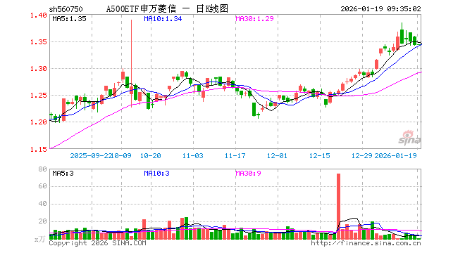1月19日,A500ETF申万菱信(560750)开盘涨0.07%,报1.343元。A500ETF申万菱信(560750)重仓股方面,宁德时代开盘跌0.24%,贵州茅台跌0.01%,中国平安跌0.08%,招商银行涨0.03%,紫金矿业涨0.40%,新易盛跌1.25%,中际旭创跌1.94%,美的集团涨0.08%,东方财富跌0.38%,长江电力涨0.34%。