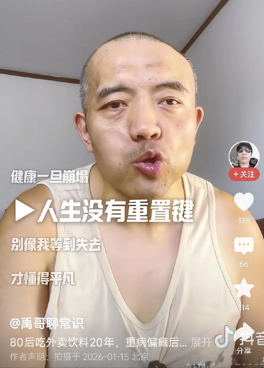 一个80后的忠告 刚刚看到一个视频,80后的管誉銘,说他用20年的代价,忠告人们远离饮料和快餐外卖…… 看看这位80后大哥,就因为喜欢喝饮料吃快餐外卖,没有节制,导致了今天处于半瘫痪的状态。他说他要用自己的切身体会,告诉人们,人生没有重置键,只有远离饮料、快餐和外卖,回归家庭厨房才是正途…… 看看这位80后的状态,令人唏嘘,确实有些害怕啊!饮料快餐和外卖,真正合格的有多少,相信大家都明白,我们不能清除,只能选择远离……