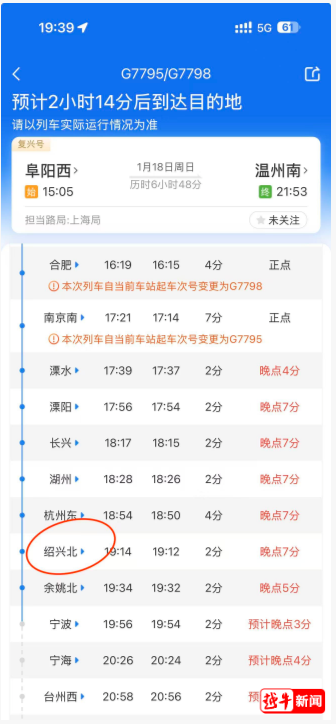 受此影响,1月19日,D3349(太原南-温州北)、G2405(大同南-上海虹桥)、G3753,G3754(呼和浩特东-杭州西)、G7795/G7798次(阜阳西-温州南)等车次将临时停运。其中越牛新闻记者查询到,G7795/G7798次(阜阳西-温州南)等部分车次经停高铁绍兴北站。