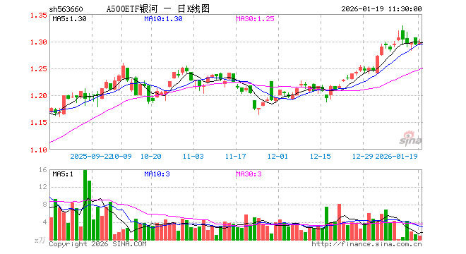 1月19日,截止午间收盘,A500ETF银河(563660)涨0.15%,报1.296元,成交额122.39万元。A500ETF银河(563660)重仓股方面,宁德时代截止午盘跌1.42%,贵州茅台跌0.28%,中国平安跌0.56%,招商银行跌0.21%,紫金矿业跌0.88%,新易盛涨1.44%,中际旭创跌1.78%,美的集团涨0.06%,东方财富跌1.59%,长江电力涨0.83%。
