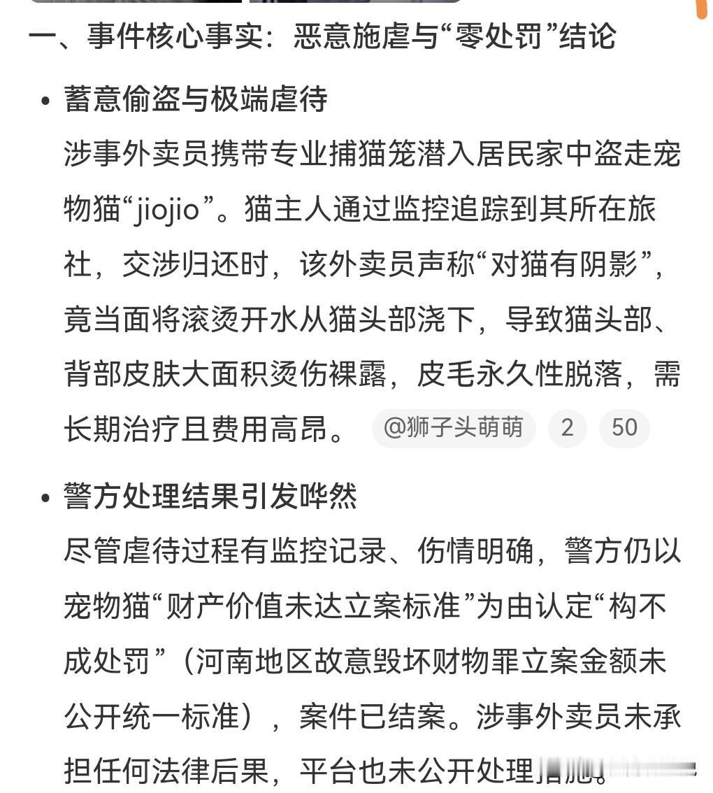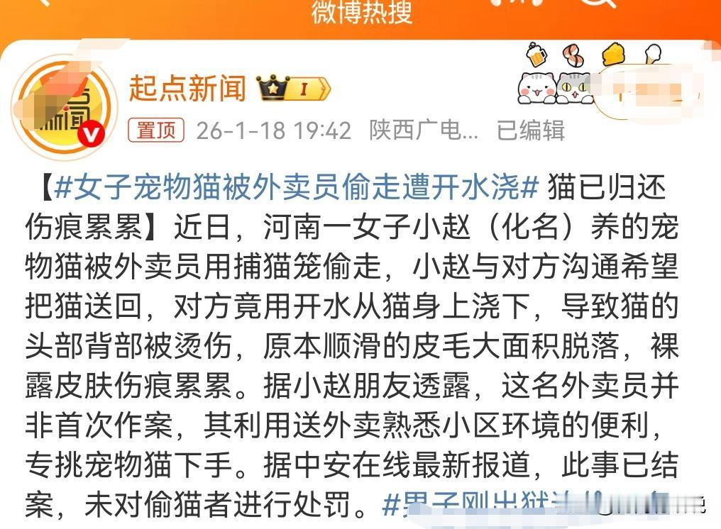 这也太没天理了吧,偷了别人的猫不用被处罚的吗? 近日河南,一女子的宠物猫被一个丧心病狂的外卖员给偷走了。 而且这个外卖员经常偷猫,这都还不处罚吗? 女子希望对方把猫还回来,没想到这外卖员丧心病狂的用开水淋猫。 最终男子没有受到惩罚。 这也太离谱了吧?法律是用来干什么的,这么不完善的吗? 做了坏事不用受到处理?又是偷东西,又是虐猫。