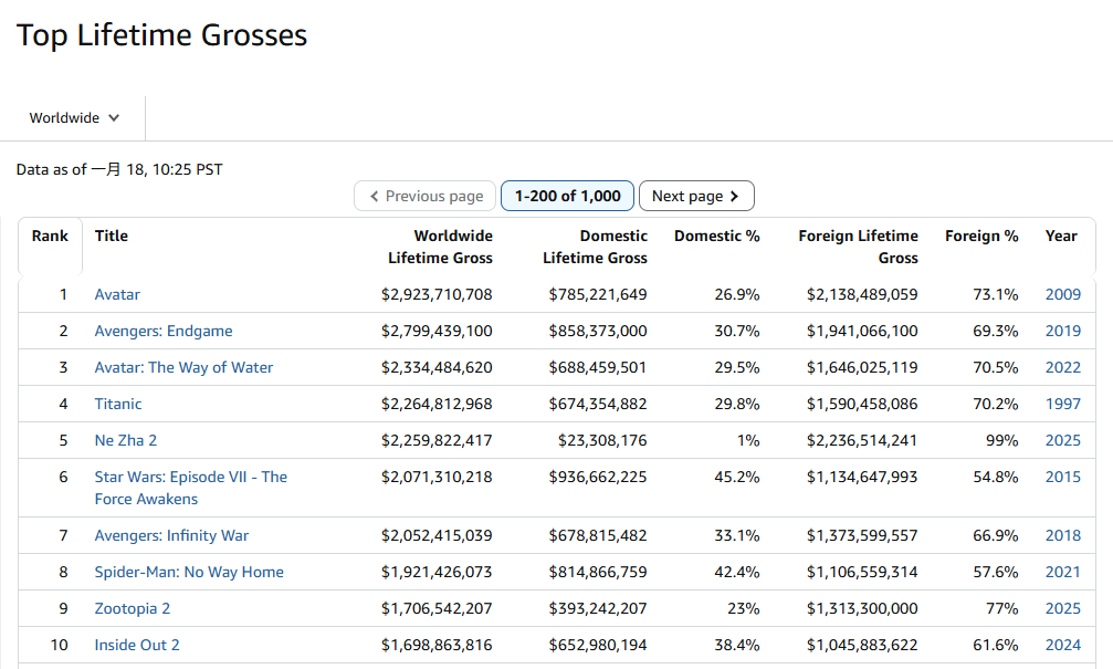 目前,国产动画电影《哪吒之魔童闹海》则凭借22.59亿美元全球票房,仍然保持着史上票房最高的动画电影纪录,位居影史全球单片票房第五。榜单第八名是2021年上映的《蜘蛛侠:英雄无归》,全球票房达19.21亿美元。
