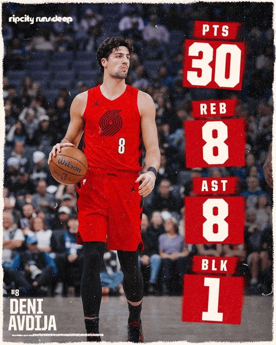 本场比赛,开拓者球员德尼-阿夫迪亚出战31分钟,18投10中,其中三分球6投2中,罚球8投8中,得到30分8篮板8助攻1封盖。