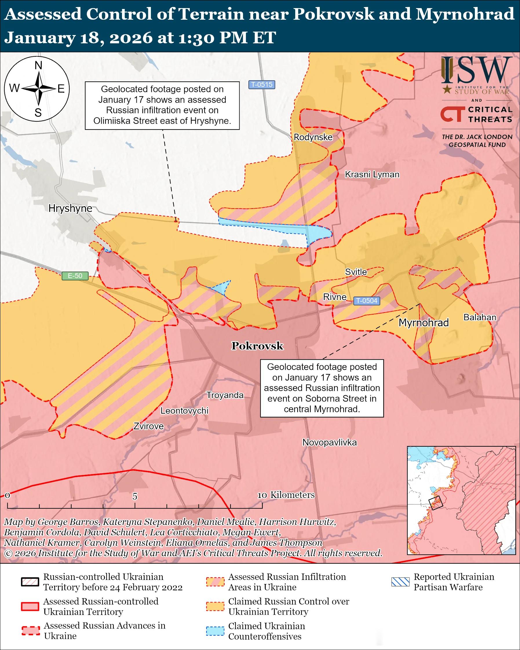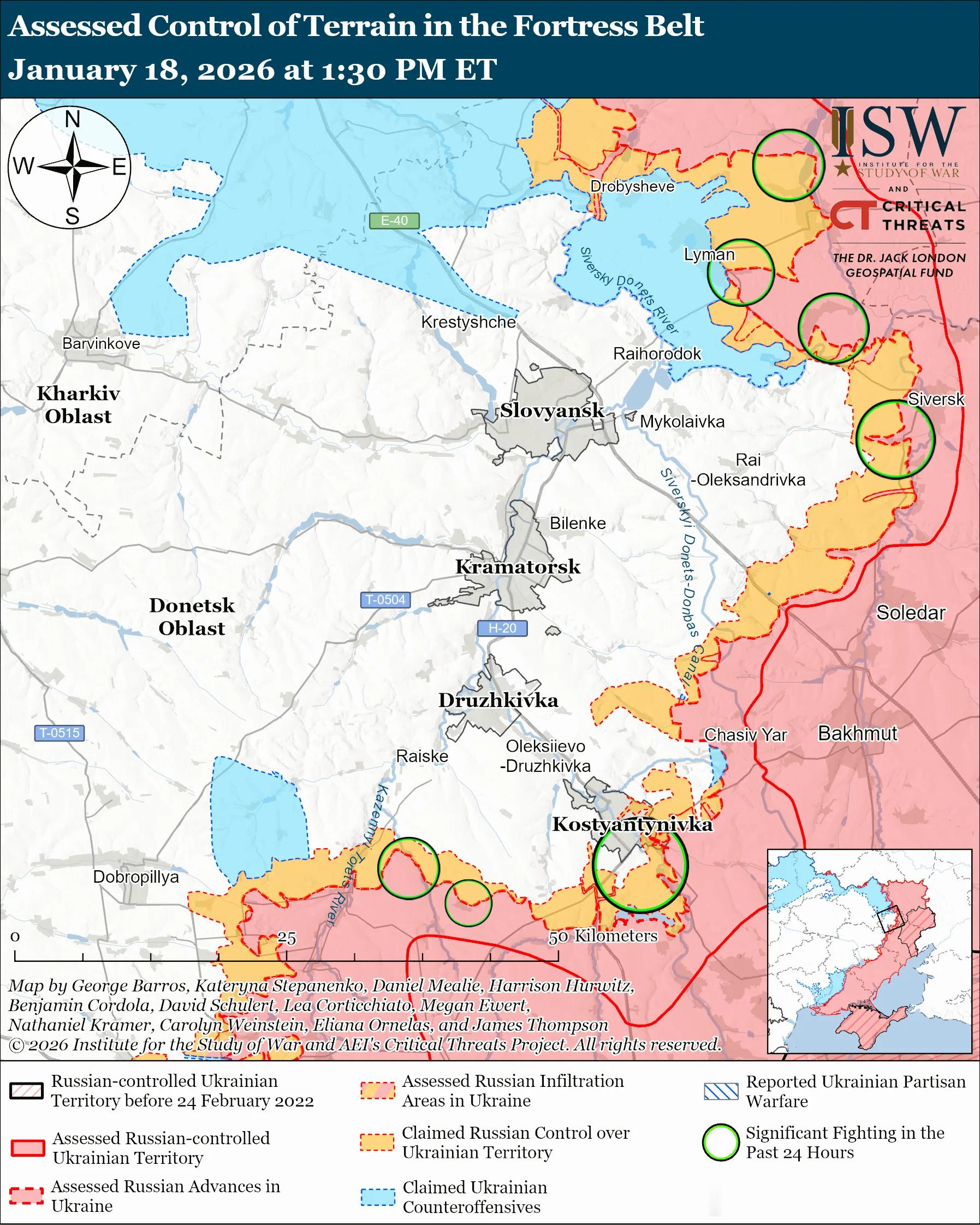 俄军主要行动3——顿涅茨克州俄军目标:占领顿涅茨克州全境,并向第聂伯罗彼得罗夫斯克州推进。乌克兰军队最近在斯拉维扬斯克方向保持阵地并取得进展。未经证实的说法:俄罗斯军事博客作者声称,俄军占领了奥泽尔内(莱曼东南)和里兹尼基夫卡以南(斯拉维扬斯克以东)。俄罗斯声称占领的区域范围:1 月 15 日发布的地理定位视频显示,俄军袭击了里兹尼基夫卡(斯拉维扬斯克以东)以南的乌克兰阵地——俄方声称,俄军在该地区保持着存在。1月17日和18日,俄军在莱曼附近、莱曼西北部斯塔夫基附近、莱曼东北部扎里奇涅、德罗比舍韦和米尔内附近、莱曼东南部迪布罗瓦、奥泽尔内和扬皮尔附近、斯拉维扬斯克东北部扎基特内附近、斯拉维扬斯克东部里兹尼基夫卡和斯维亚托-波克罗夫斯克附近以及克里瓦卢卡和卡列尼基方向、以及斯拉维扬斯克东南部尼克福里夫卡和瓦休基夫卡附近发动进攻。俄罗斯军事博客声称,乌克兰军队在奥泽尔内、扎基特内、斯维亚托-波克罗夫斯克和里兹尼基夫卡附近进行了反击。作战序列:俄第88摩步旅(第3合成集团军[CAA],南部军区[SMD])的无人机操作员正在里兹尼基夫卡以南打击乌克兰阵地。第123摩步旅(第3合成集团军)正在斯维亚托-波克罗夫斯克作战。第7摩步旅(第3合成集团军)的(FPV)无人机操作员和其他兵力继续在锡韦尔斯克和扎基特涅及其周边地区作战。乌克兰军队最近在科斯蒂安蒂尼夫卡-德鲁日基夫卡战术区推进并维持了阵地。未经证实的说法:一位俄罗斯军事博主于1月17日声称,俄军占领了明基夫卡(位于科斯蒂安蒂尼夫卡东北部)。乌克兰东部集团军驳斥了俄方的这些说法,并于1月18日报告称,乌克兰军队控制了明基夫卡。俄罗斯军事博主还声称,俄军向普里维利亚(位于科斯蒂安蒂尼夫卡北部)的东北或西部推进。俄罗斯声称占领的区域范围:1 月 18 日发布的地理定位视频显示,乌克兰军队在伊利尼夫卡(科斯蒂安蒂尼夫卡以南)东南郊区开展行动——俄方声称俄军在该地区保持着存在。俄军在科斯特扬尼夫卡附近及其内部发动进攻; Kostyantynivka 以北靠近 Virolyubivka 和 Tykhonivka 方向;科斯蒂安提尼夫卡东北部,靠近明基夫卡、马尔科夫、新马尔科夫、扎利兹尼亚斯克、邦达内和迈斯克;位于 Kostyantynivka 东南部,靠近 Oleksandro-Shultyne; Kostyantynivka 以南,靠近 Ivanopillya、Illinivka、Berestok 和 Shcherbynivka; Kostyantynivka 西南部,Stepanivka 附近; Druzhkivka以南,靠近Rusyn Yar;在德日基夫卡 (Druzhkivka) 西南方向靠近索菲夫卡 (Sofiivka) 和托尔斯克 (Torske) 方向。一位俄罗斯军事博主声称,乌克兰军队从Novodmytrigka(Kostyantynivka以北)发起反击。1月17日,在科斯佳蒂尼夫卡方向作战的乌克兰无人机营指挥官报告称,俄军正以摩托化部队绕过科斯佳蒂尼夫卡,切断乌克兰向该镇的后勤补给。该指挥官还表示,俄军正试图骑摩托车渗透到科斯佳蒂尼夫卡镇内。此外该指挥官还指出,科斯佳蒂尼夫卡方向的俄军正在使用光纤无人机和无线电遥控(FPV)无人机拦截乌克兰的后勤补给。作战序列:据报道俄第20摩步师(第8集团军,SMD)第68独立侦察营的FPV无人机操作员正在袭击赖斯克(德鲁日基夫卡西南)和新安德里夫卡(德鲁日基夫卡西)的乌克兰天线和弹药库。第238炮兵旅(第8集团军)的FPV无人机操作员继续袭击科斯蒂安蒂尼夫卡方向的乌克兰阵地。1月18日俄军继续在多布罗皮利亚战术区开展进攻行动,但并未取得确切进展。未经证实的说法:一位俄罗斯军事博主声称,俄军占领了新顿巴斯(多布罗皮利亚以东)。1月17日和18日,俄军在多布罗皮利亚东部的新顿巴斯附近和多布罗皮利亚东南部的扎波维德内附近发动进攻。作战序列:据报道俄第150摩步师(第8集团军,SMD)的无人机操作员正在多布罗皮利亚方向打击乌克兰军队。第61独立海军陆战旅(北方舰队)的防空和炮兵部队正在多布罗皮利亚方向拦截乌克兰无人机。1月18日俄军继续向波克罗夫斯克方向发起进攻,但并未取得确切进展。评估俄罗斯渗透:1 月 17 日发布的地理定位视频显示,乌克兰军队在米尔诺赫拉德中部(波克罗夫斯克以东)和格里申内东部(波克罗夫斯克西北部)袭击了俄军。ISW 评估认为,这两次行动都是俄军渗透行动。未经证实的说法:俄罗斯军事博客作者声称,俄军向赫里希涅以东和以南以及乌达奇涅以北(波克罗夫斯克西南方)推进。1月17日和18日,俄军在波克罗夫斯克附近及城内发动进攻;在波克罗夫斯克西北部靠近赫里申内的地方发动进攻;在波克罗夫斯克北部靠近罗丁斯克和比利茨克的地方发动进攻;在波克罗夫斯克东北部靠近苏赫茨克和切尔沃尼(克拉斯尼)莱曼的地方发动进攻;在波克罗夫斯克东部靠近米尔诺赫拉德和里夫内的地方发动进攻;在波克罗夫斯克西南部靠近科特利内、乌达奇内和莫洛杰茨克的地方发动进攻。1月18日,一名在波克罗夫斯克方向作战的乌克兰无人机营指挥官报告称,尽管天气寒冷多雪,俄军仍在以两到三名士兵组成的小队继续发起进攻。该无人机营指挥官表示,俄乌双方都在努力适应雪地环境,因为积雪便于俄乌无人机操作员追踪脚印,同时也在努力避免留下可探测的热信号。该无人机营指挥官指出,俄军并未积极使用重型装备,而是继续使用轻型装备发起攻击,甚至在与该营责任区相邻的某些地区还使用了马匹。战斗序列:据报道俄第 177 独立海军步兵团(里海舰队)