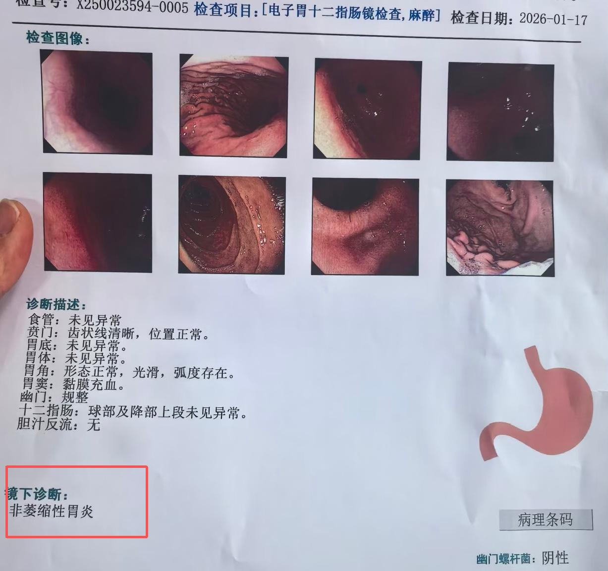 推开诊室的门,老陈握着最新的胃镜报告,眼圈微红。 九个月前,他还记得自己第一次躺上检查床时的恐慌。胃痛持续了大半年,服药也不见好转。作为家里的顶梁柱,老陈不敢倒下。妻子体弱,儿子还在读大学,他开着那辆跑了十几年的出租车,每天十几个小时在路上。疼痛发作时,方向盘前的每一分钟都是煎熬。他最怕的,是病理报告里那些陌生的医学术语,正是因为陌生,所以也会让他整夜失眠。 老陈的胃炎不是一天形成的。常年饮食不规律,为了多跑几单常常午饭拖到下午三点,晚饭变成宵夜。胃镜检查显示黏膜广泛充血,多处陈旧血痂,这是长期慢性炎症的痕迹。 他说:“医生,我是不是很严重?还能开车吗?” “没事,不严重,可以治好的”,我说;基于老陈幽门螺杆菌阴性的情况,除了规范用药,更重要的是生活方式的彻底改变。我告诉他:“你的胃就像那辆出租车,需要定期保养,不能一直开到熄火。最初几周最难熬。老陈要重新学习吃饭,定时定量,细嚼慢咽。他的妻子每天凌晨四五点就得起床给他做饭,毕竟跑车吗,就是早出晚归。他的儿子也非常担心他,有次复查是他儿子陪他来的,听说是直接从大学请假回来的,就是担心父亲。 但是幸好,一切努力都是值得的,2026年1月17日的复查报告让他们都松了一口气。胃镜显示原先的萎缩性改变和糜烂已经消失。老陈最关心的“萎缩”二字不见了。复查那天,老陈带了一袋老家特产的红枣,腼腆地说:“医生,这枣养胃,您也常加班。”我没收红枣,但收下了这份心意。 胃病的治疗从来不是单靠药物。老陈的改变让我看到,当患者真正理解自己的身体,当家人成为康复的支持系统,医学的力量才会最大化。他的胃黏膜从“萎缩伴糜烂”到“非萎缩性”的转变,是医患共同努力的见证。 每个胃病患者的背后,都是一个家庭的牵挂。作为医生,我们看到的不仅是黏膜上的变化,更是患者重回健康生活的希望。老陈的出租车还在跑,但他会记得要按时吃饭,吃好喝好才能健康生活,家人才不会为他担心。 慢性胃炎是长期过程,定期复查、坚持治疗、改善生活习惯同样重要。如果你或家人正在经历类似的困扰,请不要独自承受,正确治疗才是最重要的。