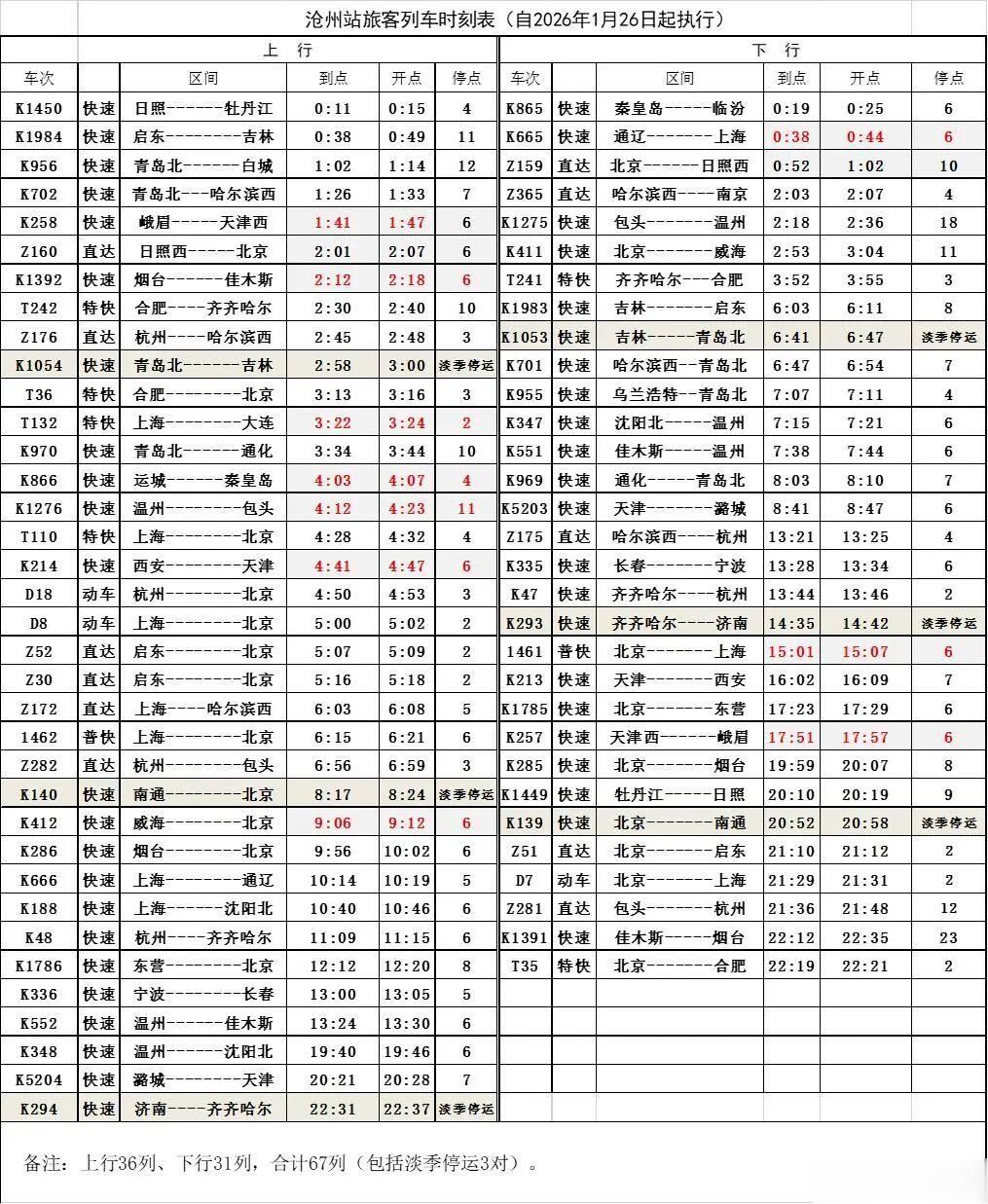 国铁集团根据年度工作安排,组织编制完成了2026年第一季度调整列车运行图,自2026年1月26日零时起实行。沧州站有关变化如下: