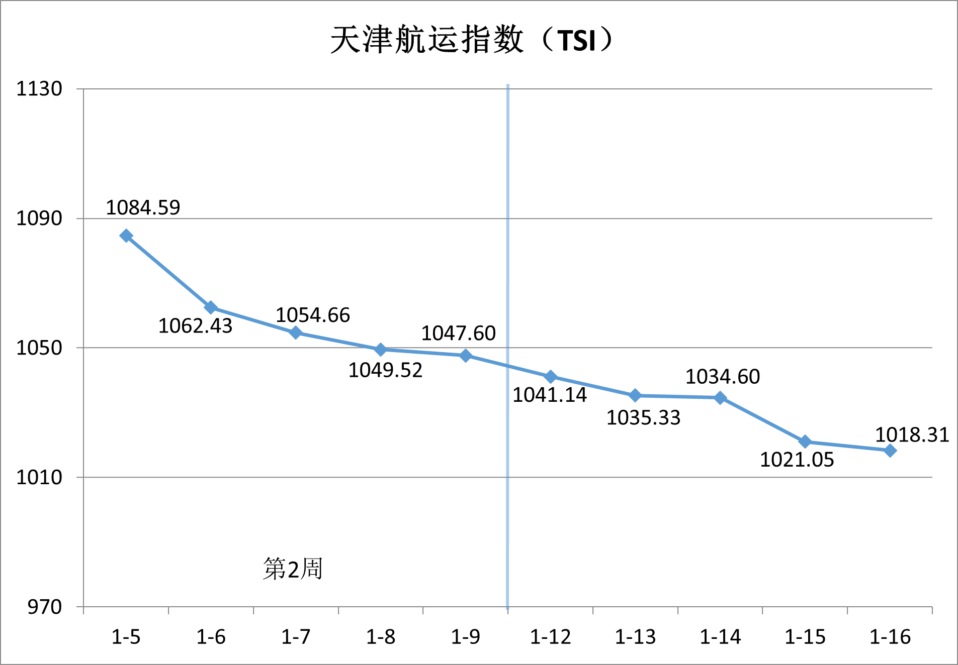 新华财经天津1月19日电(记者李亭)记者从天津国际贸易与航运服务中心获悉,2026年第3周(1月12日-16日),中国北方内外贸海运价格的风向标——天津航运指数重心持续下移,最终收于1018.31点,相比1月9日(第2周最后一个发布日)累计下跌29.29点,累计跌幅为2.80%。