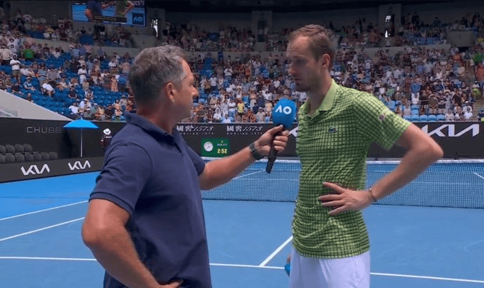 赛后现场采访,梅德韦杰夫谈到了去年的情况以及目前的状态:“今天并不轻松。第一场比赛。不同的赛事,大满贯。去年我几乎每场比赛都首轮出局,唯独这里例外。”