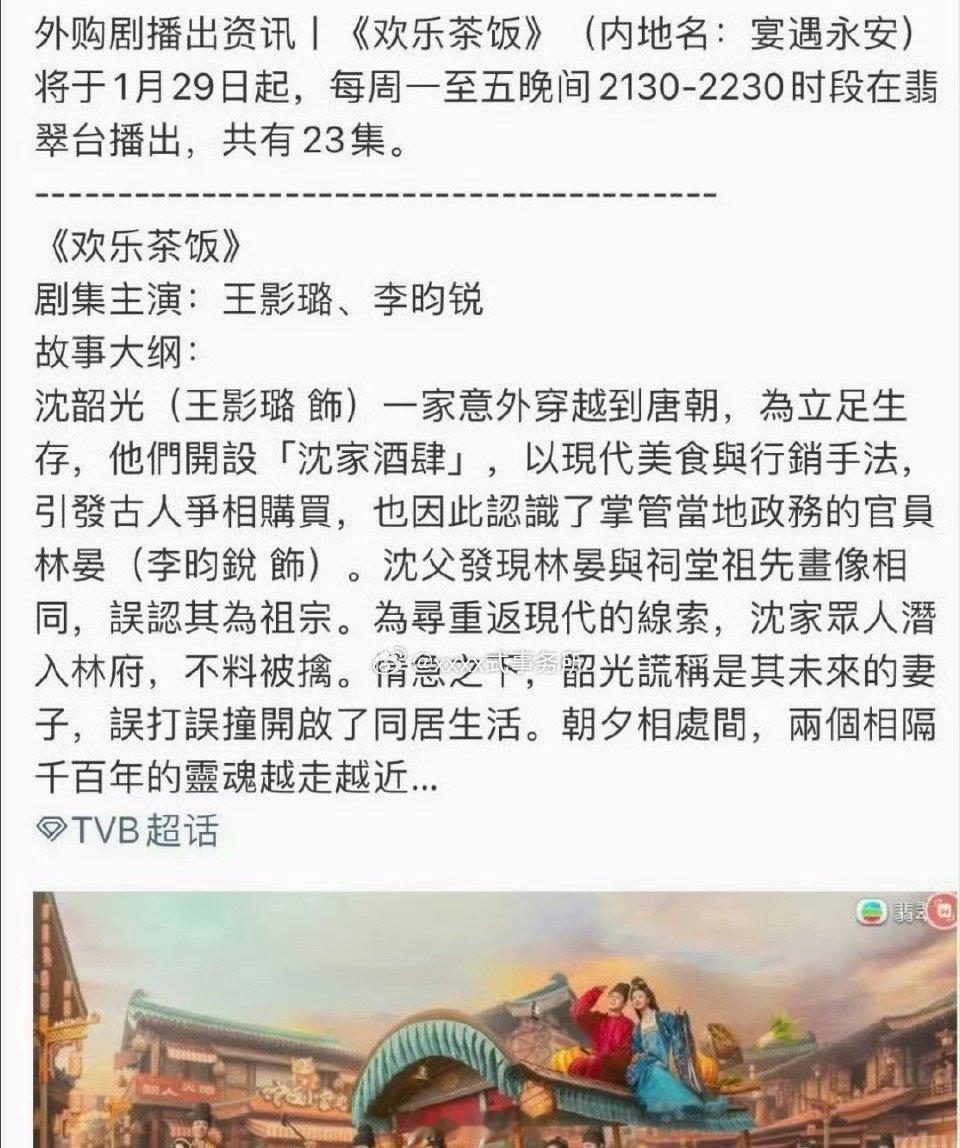 李昀锐宴遇永安TVB开播李昀锐的扛剧能力又一次靠实力出圈了啊,李昀锐、王影璐等人主演的电视剧《宴遇永安》将在TVB播出,更名为《欢乐茶饭》。小林在剧中的演技很是惊艳,期待李昀锐靠演技圈粉啦!宴遇永安1月29日起在tvb翡翠台播出