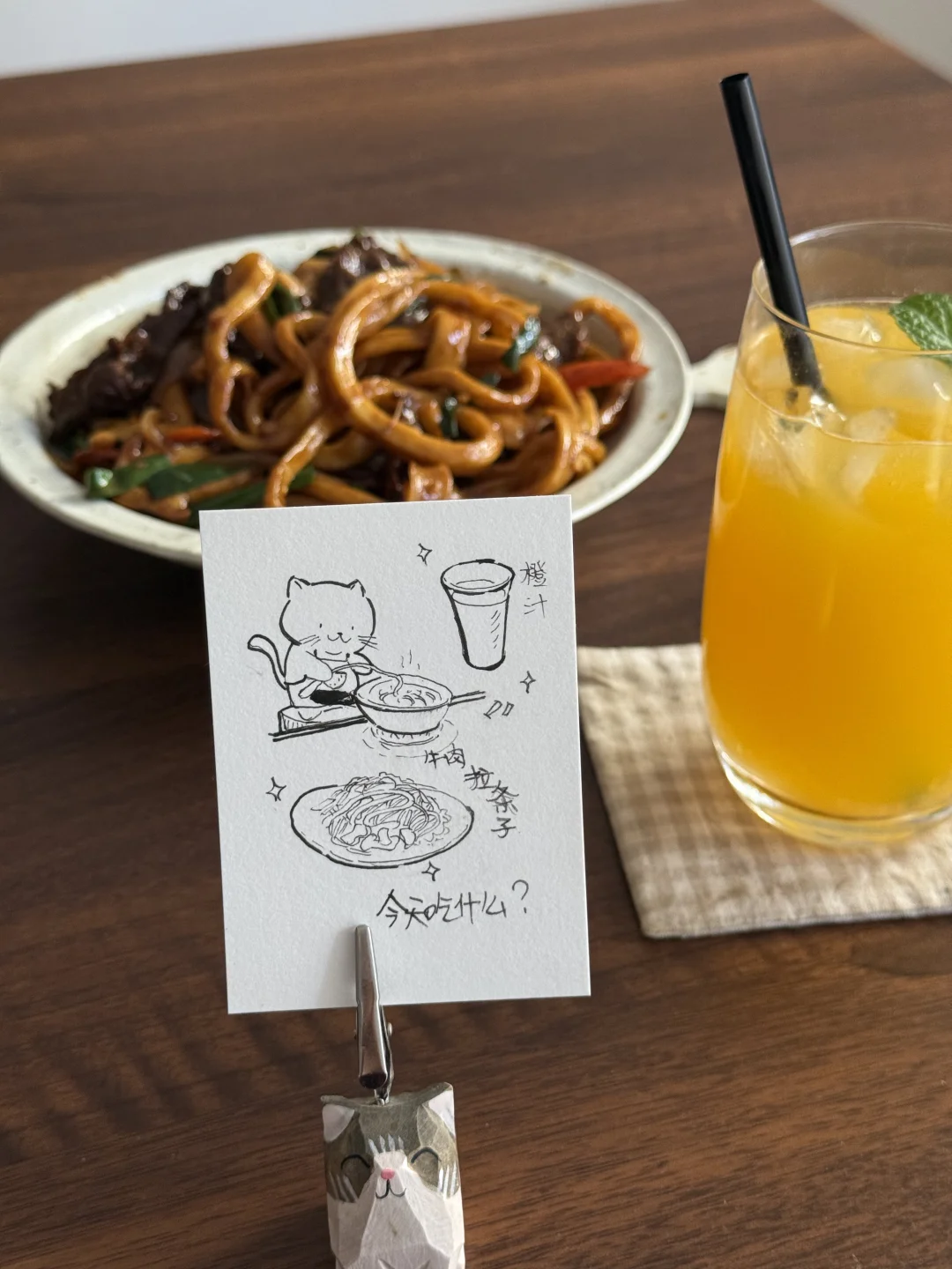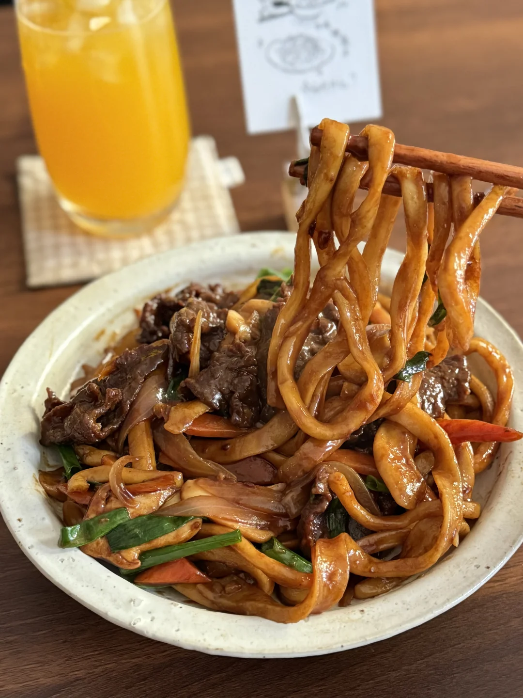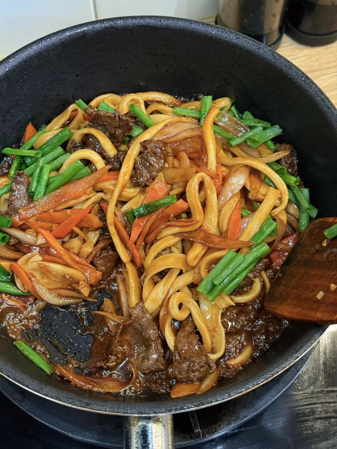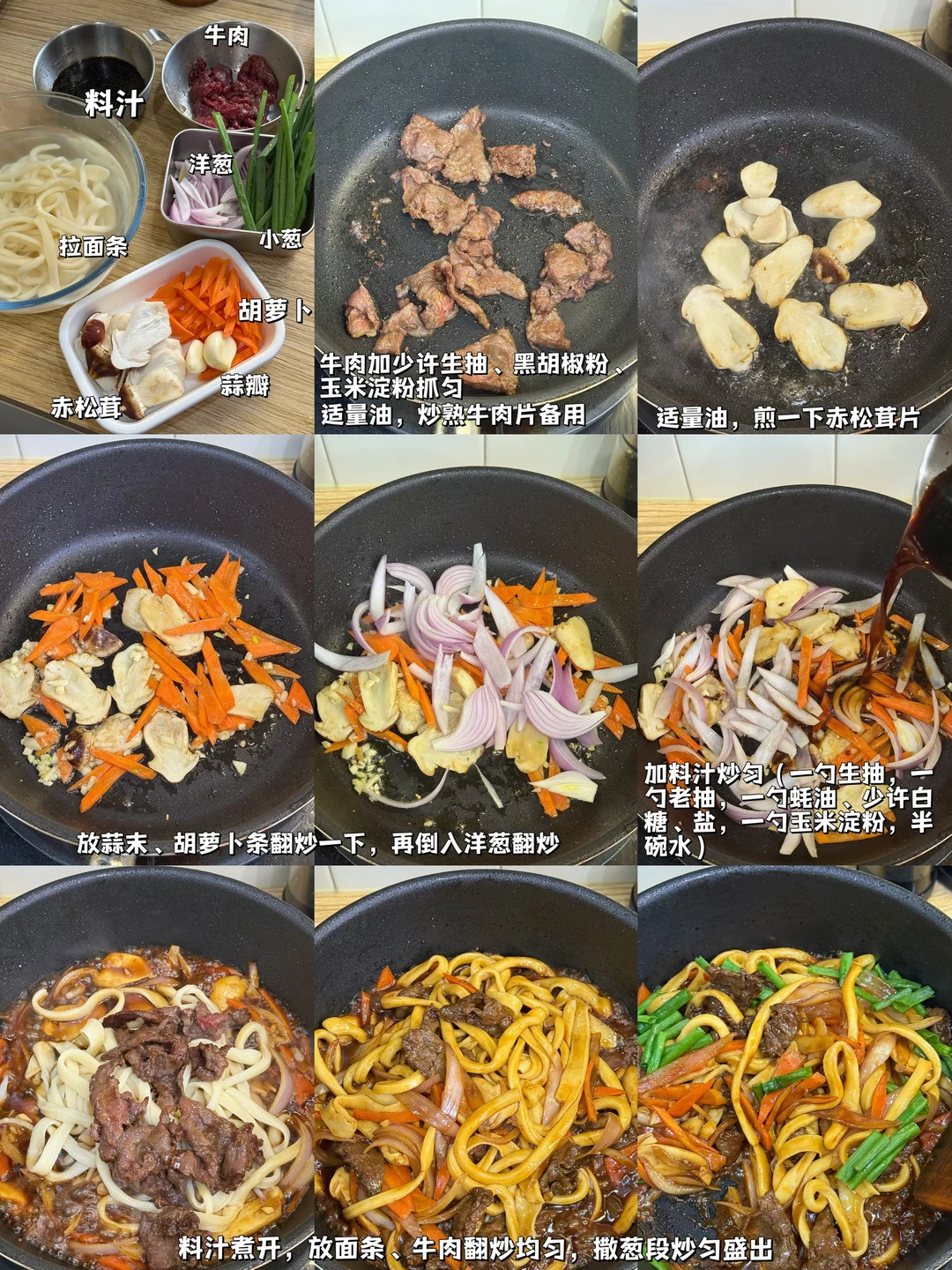 今日午餐:牛肉赤松茸炒拉面,橙汁 周末孩子在家,突然点餐要吃“拉条子”。“拉条子?你哪瞧来的呀?”我一时还真不知道是什么,赶紧查了下——哦,原来是面团拉出来的面条。 正宗做法得放辣椒,但她吃不了辣。那就按她口味做一个,让她也参与揉面、拉面,兴致还挺高。 用150克面粉做的面条,炒出一锅,粗粗的面条很筋道又有锅气,她吃得嘎嘎香。 其实这锅面,我一个人也能轻松解决掉😅。