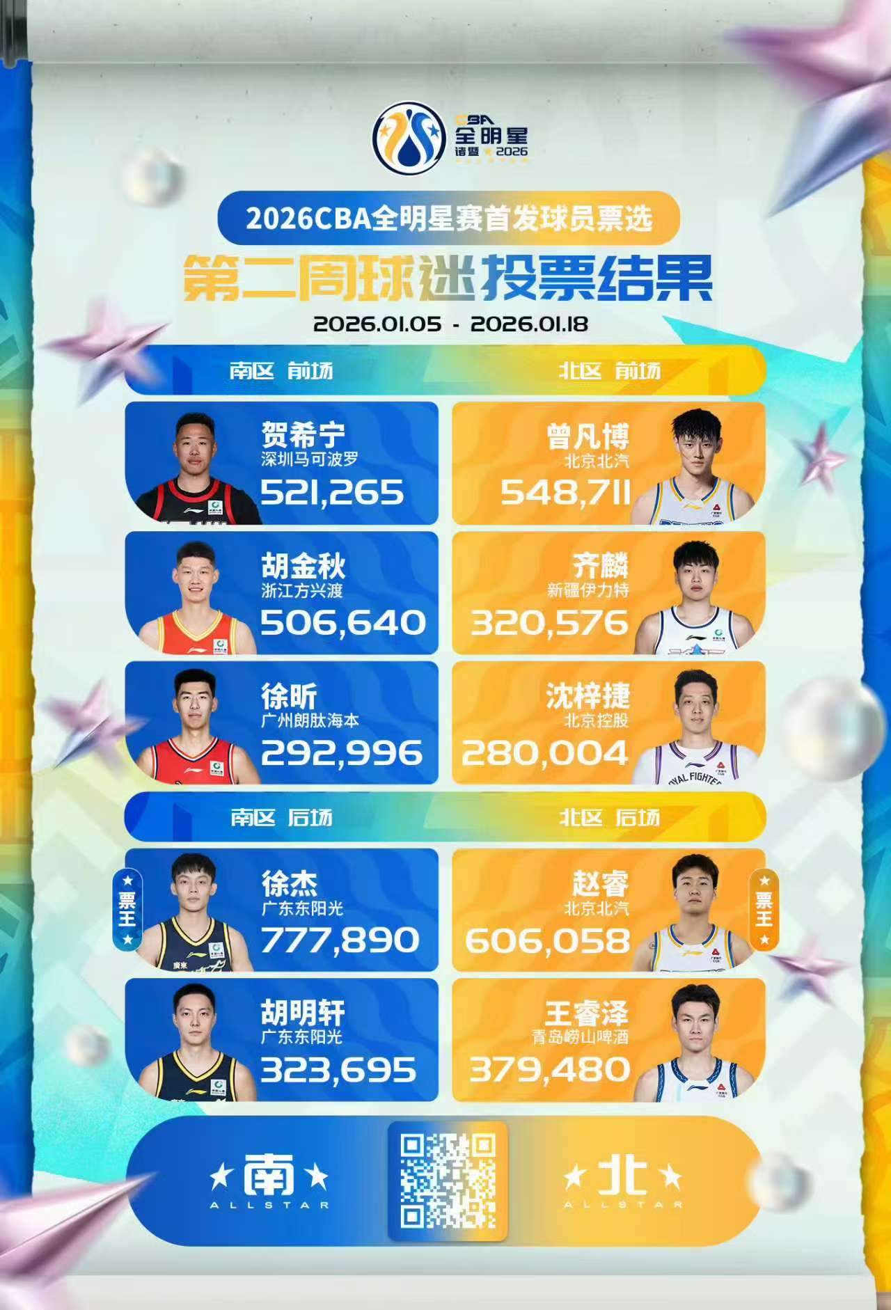 全明星第二周的投票结果已经出来了,徐杰票数(777890)继续领跑票王,赵睿票数(606058)也是继续占据北区的榜首。徐杰和赵睿的人气还是比较高的,即使最近徐杰状态有点下滑,赵睿伤缺这么久。除了这两个人以外,庞峥麟的票数也是非常多,作为CBA新人,他这个赛季的表现足够优秀,在广东广西也拥有非常多的球迷,所以他的票数也是非常高。
