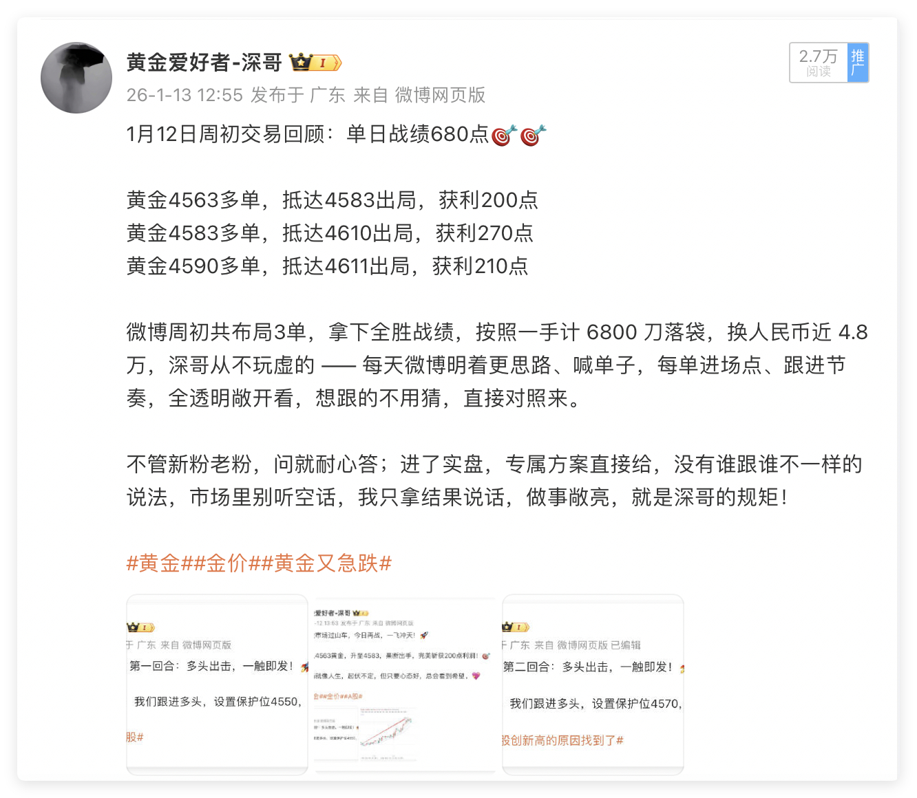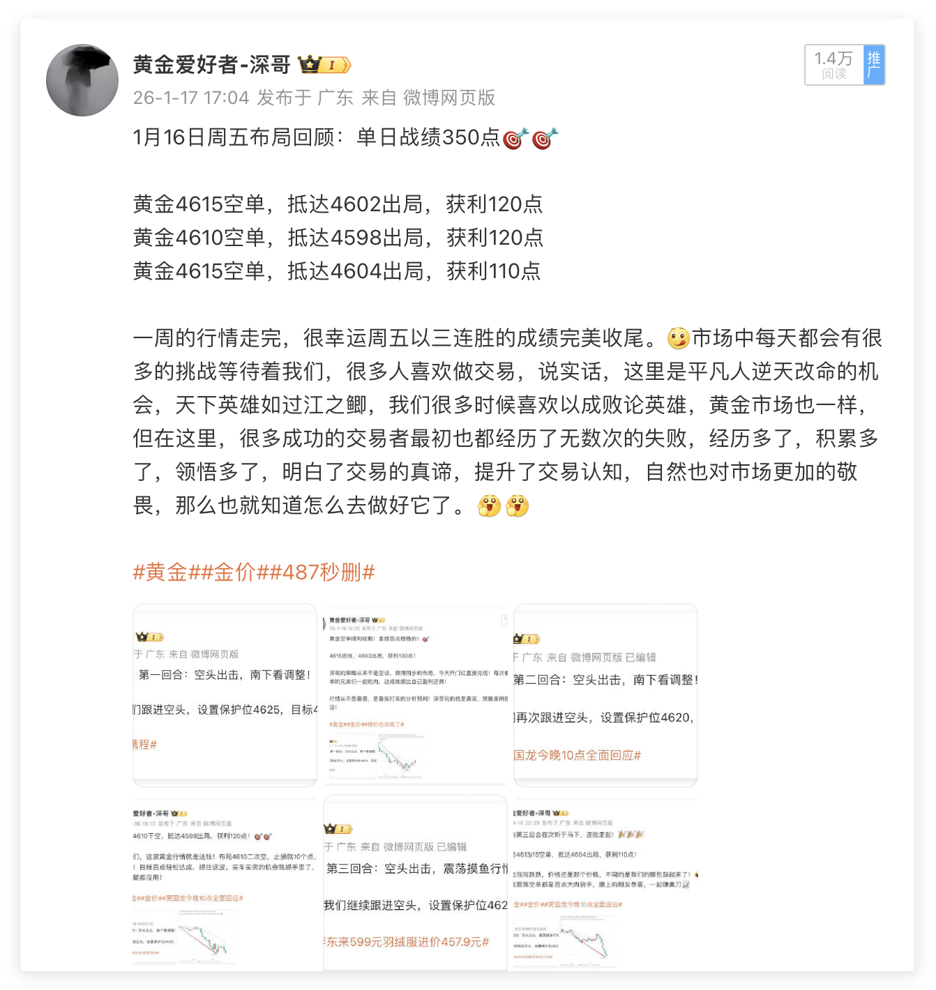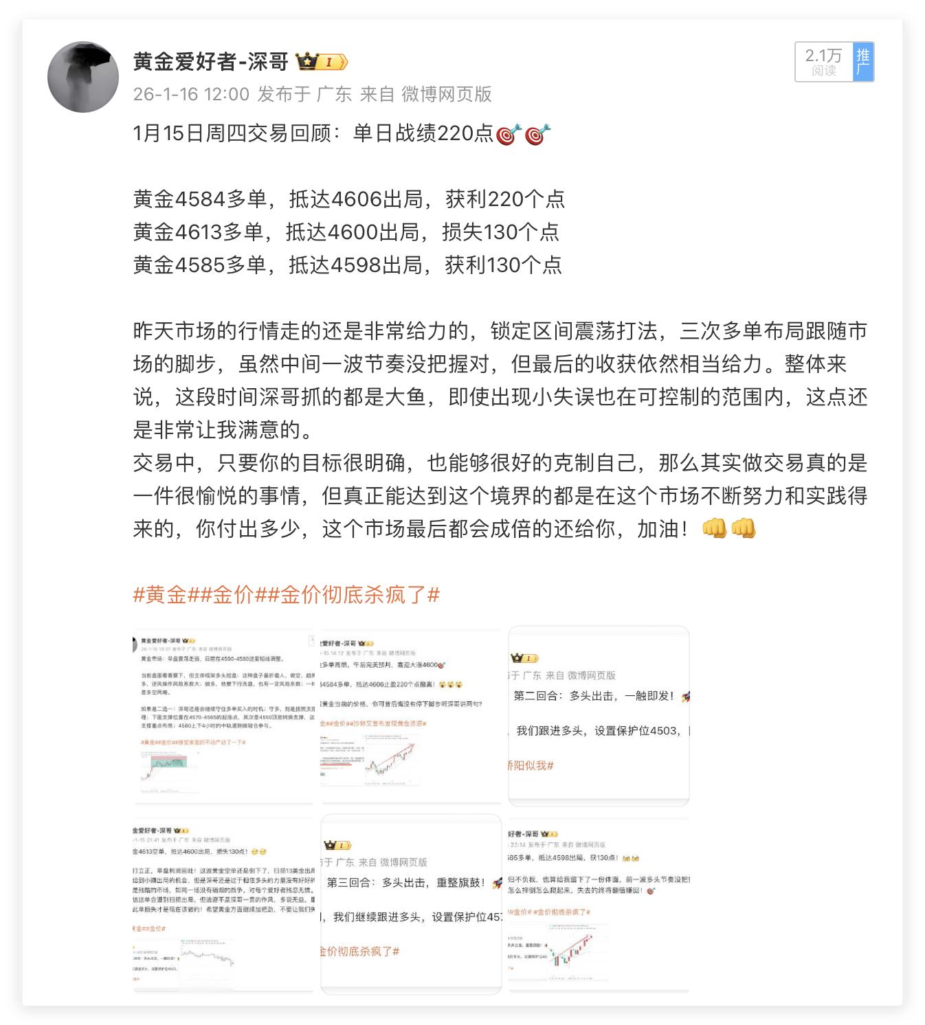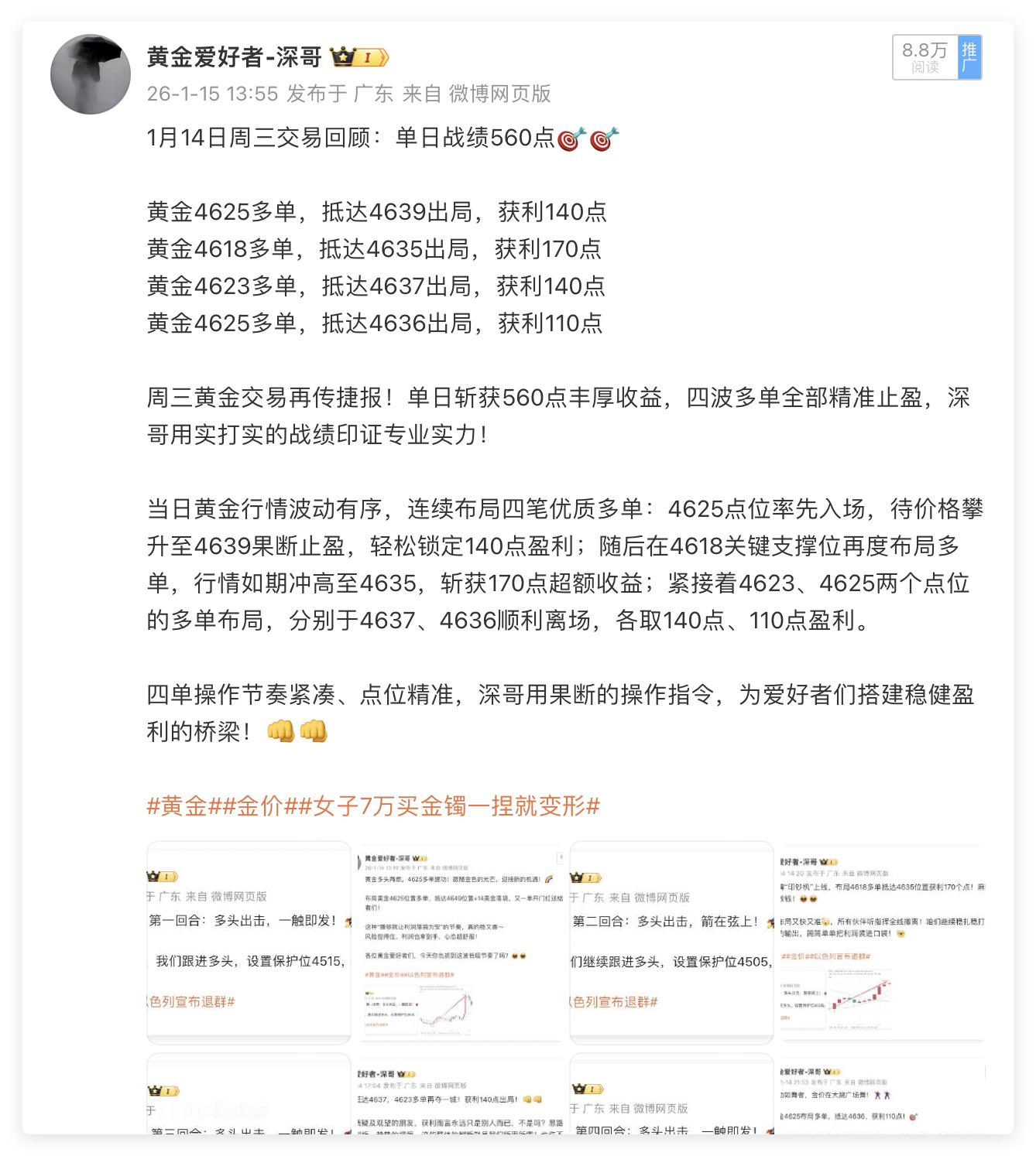周结报告:2010个点盈利落袋,完美结束周交易!🎉🎉🎉这一周时间的交易,深哥用数据说话:📈 15单精准布局,斩获2010个利润点!但这不仅仅是数字的胜利,更是教学的成功!在这一个月里,很多大资金的爱好者在跟随深哥稳健收获的同时,开始尝试独立交易。虽然新手期难免有事与愿违的时间,但在深哥专业且细心指导建议下,大家最终都实现了自己的诗和远方。看着大家从“跟单”到“懂单”,认知水平一步步的提升,以轻松完美的姿态结束一周的交易,这比单纯的盈利更让深哥自豪!新的一周起始,我们继续乘风破浪,联系深哥加入实盘,带你从“会做”到“会赢”!黄金金价金价波动