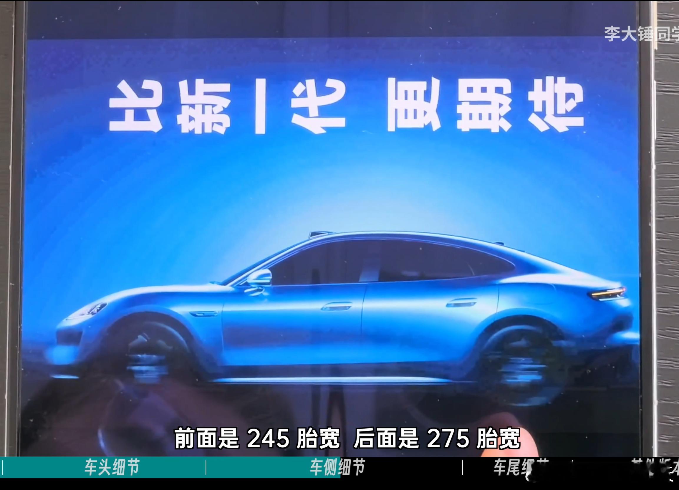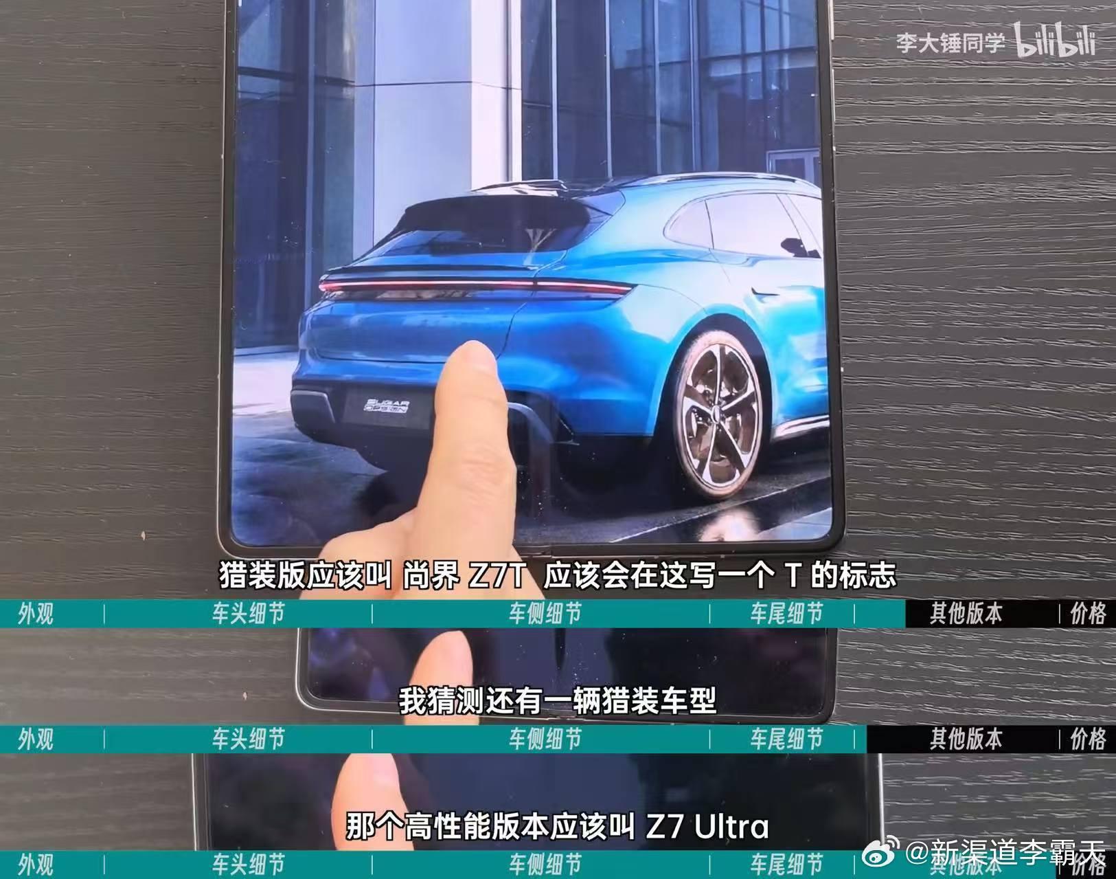 看来大锤的尚界Z7爆料,除了图1这些细节外,还有几个有意思的:1️⃣多种轮毂样式(图2),其中还有一个带车身同色外圈饰板的轮毂,不禁让我想起了图32️⃣胎宽(图4):前245,后275。这轮胎配置给的挺高了,给后的良好轮抓地力提供了基础。3️⃣车尾LOGO(图5):可以按下去,是后备箱开启的按钮。4️⃣其他版本(图6):基本可以确认,有旅行版,还有高性能Ultra版。尚界Z7亮点前瞻霸天资讯