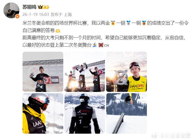 苏翊鸣总结四场世界杯 苏翊鸣距离大考只剩不到一个月发博:米兰冬奥会前的四场世界杯比赛,我以两金🏅一银🥈一铜🥉的成绩交出了一份令自己满意的答卷🫶距离最终的大考只剩不到一个月的时间,希望自己能够更加沉着稳定、从容自信,以最好的状态登上第二次冬奥舞台🏂🦋🇨🇳
