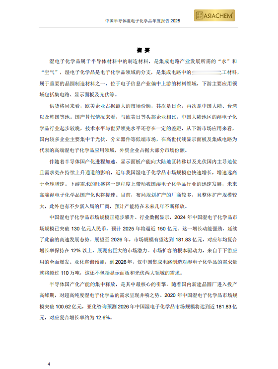 亚化咨询现已推出《中国半导体湿电子化学品年度报告2025》(11月版),共92页,内容包括市场供需分析及预测、企业分析及预测、项目整理、全球行业格局分析等多个内容。