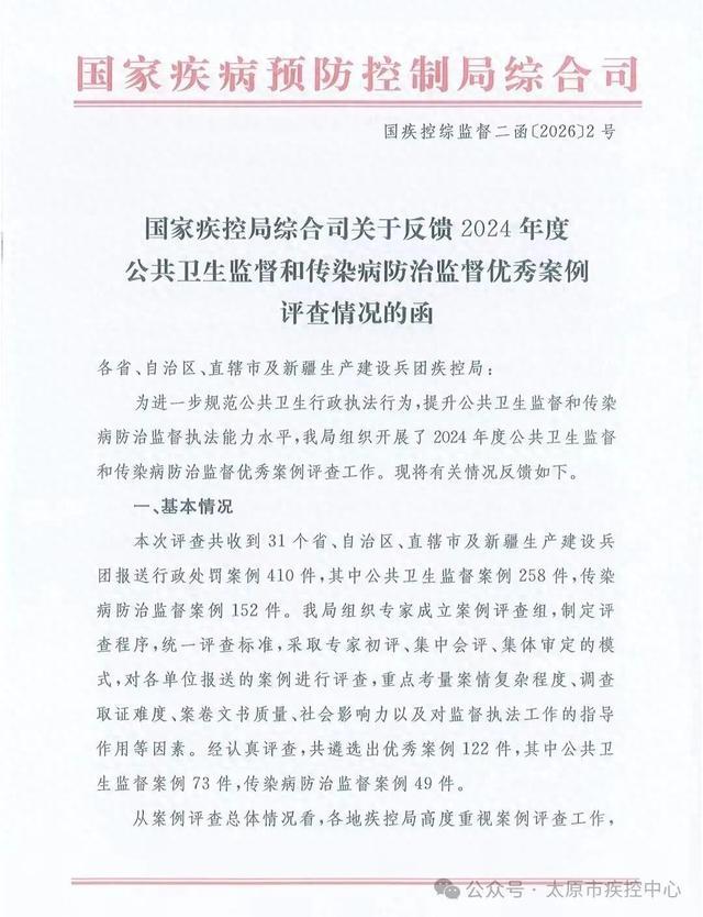 近日,国家疾控局公布了2024年度公共卫生监督和传染病防治监督优秀案例评审结果,太原市疾控中心报送的《某医院放射性职业病危害建设项目未按照规定进行职业病危害控制效果评价且逾期不改案》从全国参评的258件公共卫生监督案例中脱颖而出,获评2024年度公共卫生监督优秀案例。