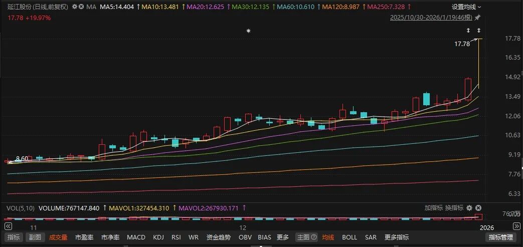 1月19日,延江股份复盘后股价剧烈波动,午后直线拉升封涨停板。截至收盘,股价报17.78元/股,总市值为59.17亿元。