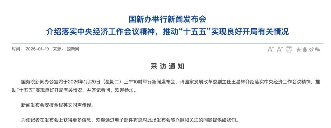 国务院新闻办公室将于2026年1月20日(星期二)上午10时举行新闻发布会,请国家发展改革委副主任王昌林介绍落实中央经济工作会议精神,推动“十五五”实现良好开局有关情况,并答记者问。