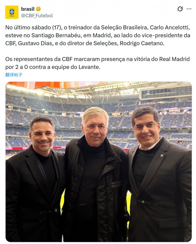 巴西国家队官方更新社媒动态,晒出安切洛蒂与巴西足协副主席迪亚斯、国家队总监卡埃塔诺在伯纳乌的合照。