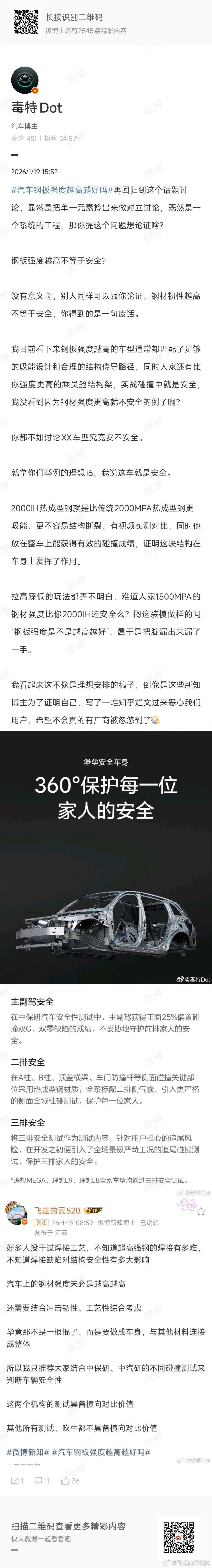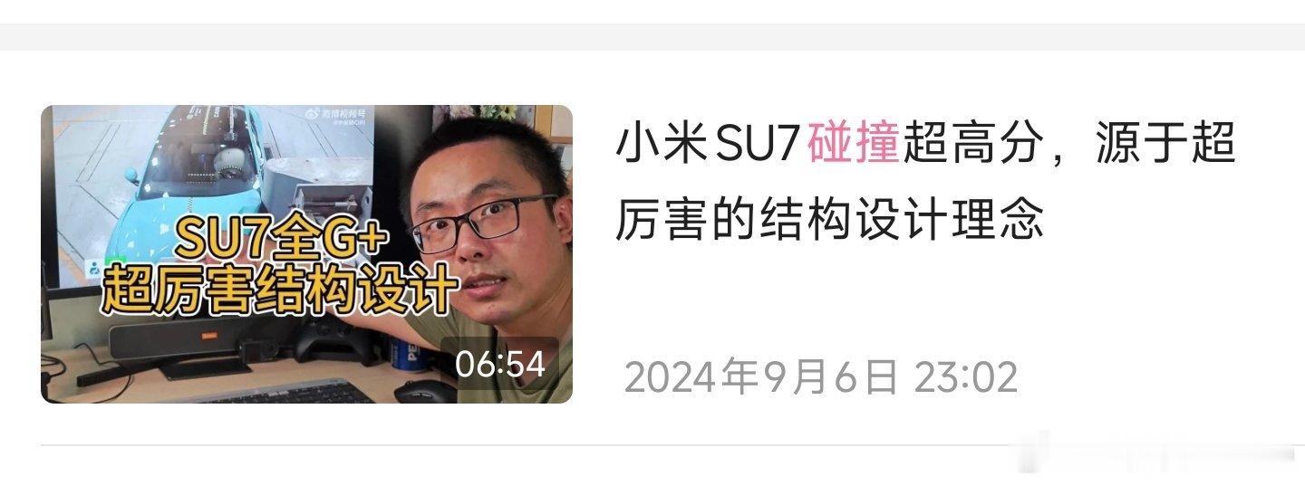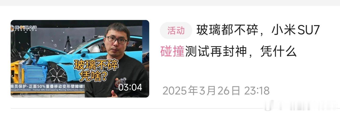 说到这个话题汽车钢板强度越高越好吗 ,实际上没有任何品牌倾向,而且在多处回复网友:25%偏置碰撞,玻璃都没碎的车型,安全冗余非常充足(图1)这里说的就是小米SU7,而且SU7刚刚出来碰撞成绩的时候我就出过视频进行过分析讲解我的博文没有提过任何款车型,没有提过任何一个品牌,恰好理想的一位材料研发专家回复了而已。甚至我平时跟理想都没太多联系我有拉踩任何品牌吗,有说使用1500mpa钢材的车型更安全吗,有说2000mpa的车型不安全吗只是说超高强度钢材会有更多工艺上的挑战,真实安全性建议大家看碰撞测试。那么SU7就是有史以来我认为正面偏执碰撞最强的车型。还有评论区的,我当初破防,纯粹因为小米官方把我定义成“米黑”,你倒是找找我何时黑过小米,始终都是铁杆米粉。作为铁杆米粉,被判成米黑,我破防了,但跟投放毛线关系都没有。我还没来微博写东西的时候,就买了创始版SU7,喜欢小米跟投放没有任何关系。十几年前从小米1支持到现在,也没想过什么投放。