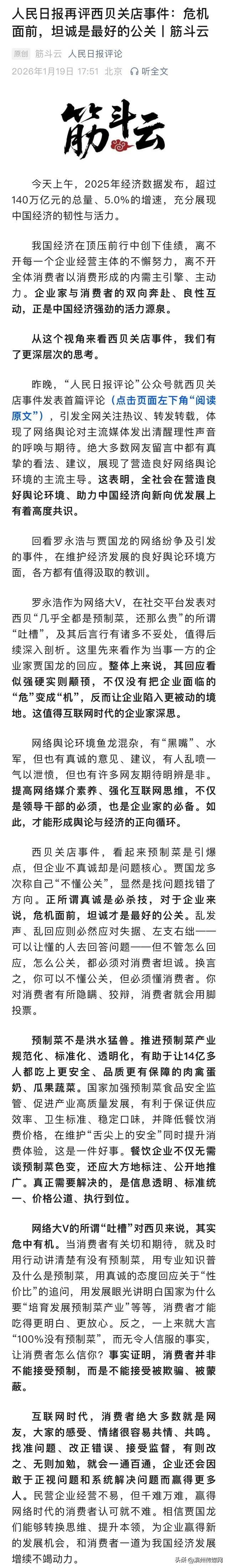 1月18日,人民日报发布评论文章《人民日报评西贝关店事件:网络舆论环境不能成为企业发展的短板》,其中提到:西贝事件早已超出口水战,罗永浩们、贾国龙们、新浪微博等平台们,都有要汲取教训的地方,“营造清朗的网络空间”绝不是一个虚设的命题,而是各方必须时刻答好的共同答卷,谁违背了这一守则,谁终将受到严厉惩罚。