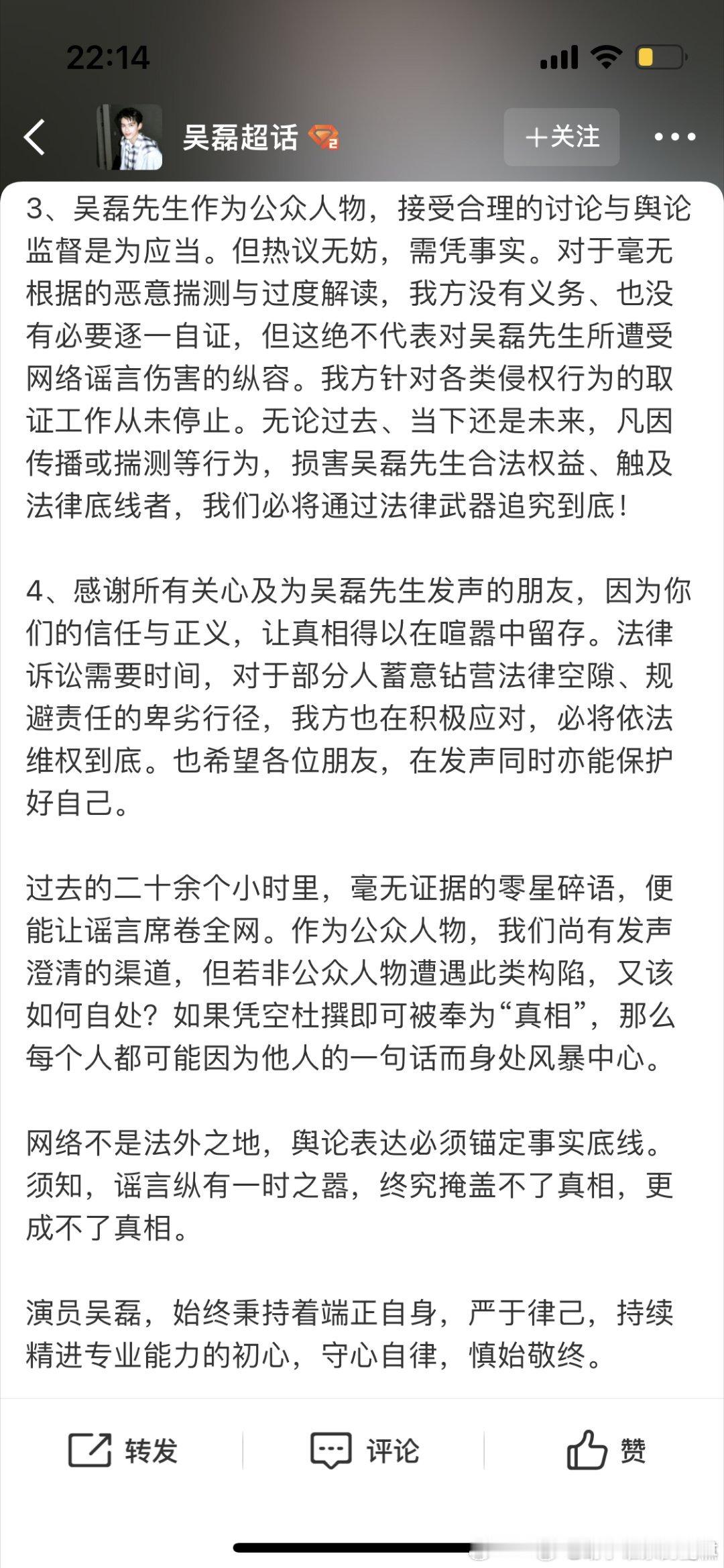 吴磊工作室再发声明 吴磊工作室咋不在第一时间这样发,白天的就不太行,这个就有力多