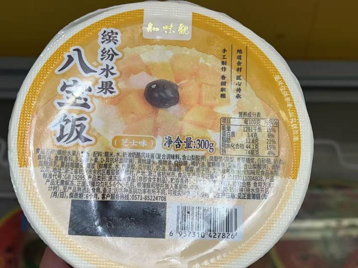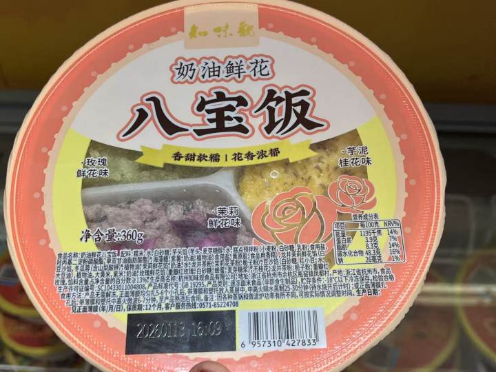 衢江路上的知味观门店里,除了传统的血糯八宝饭和新春八宝饭之外,今年还新增加了“奶油鲜花八宝饭”,一盒包括玫瑰鲜花、芋泥桂花和茉莉鲜花三种口味,此外还有“缤纷水果八宝饭(芝士味)”,记者研究了一下配料表,里面应该有凤梨、黄桃、蔓越莓等多种口味。
