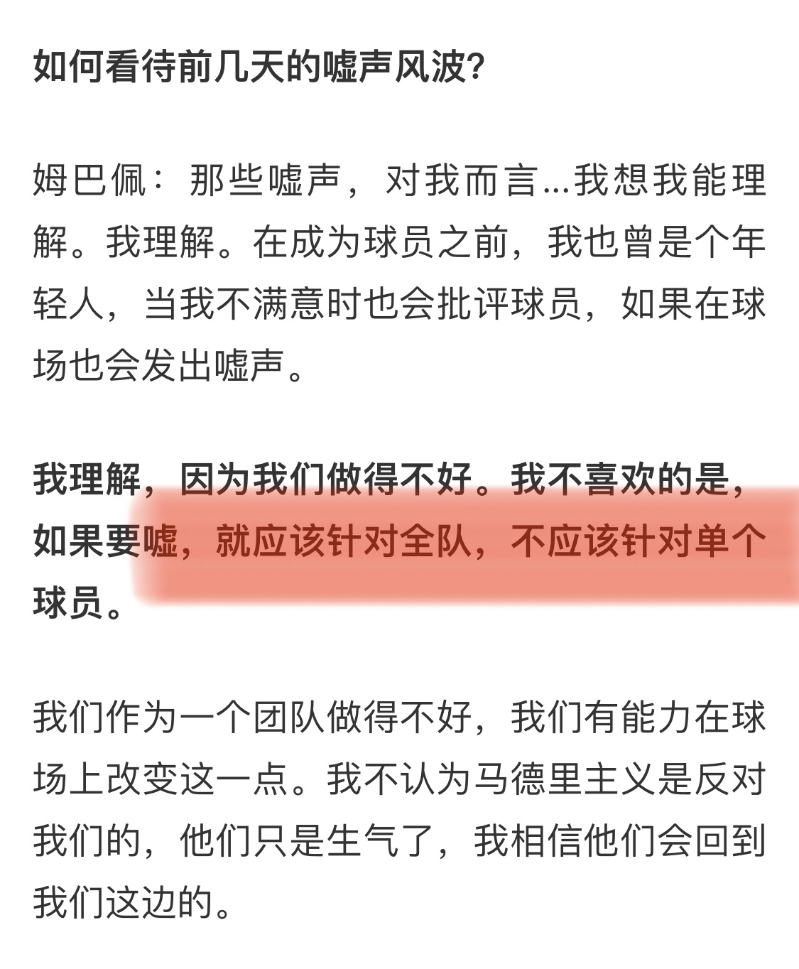 八佩高情商“要嘘就嘘全队,不应该针对某个球员”