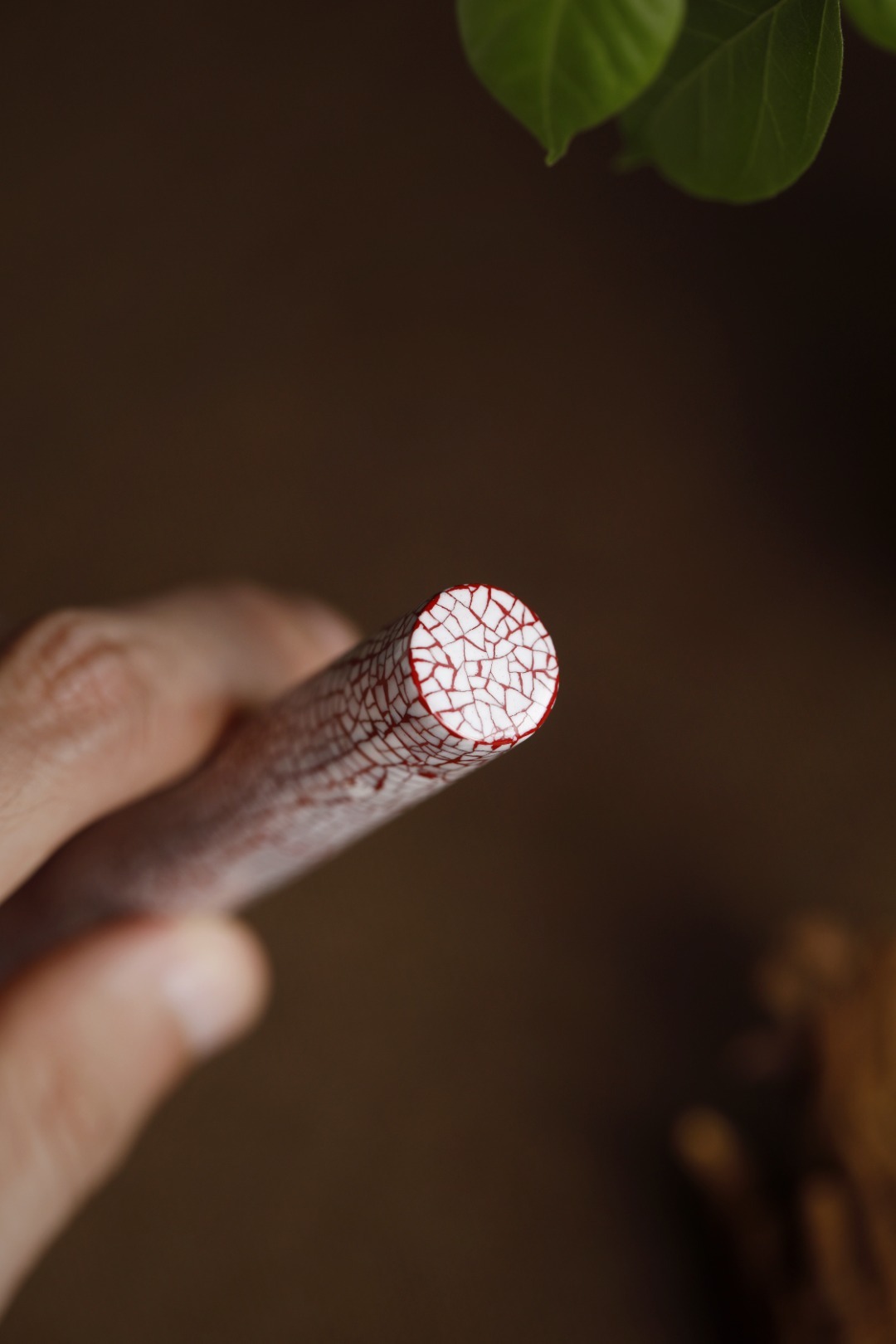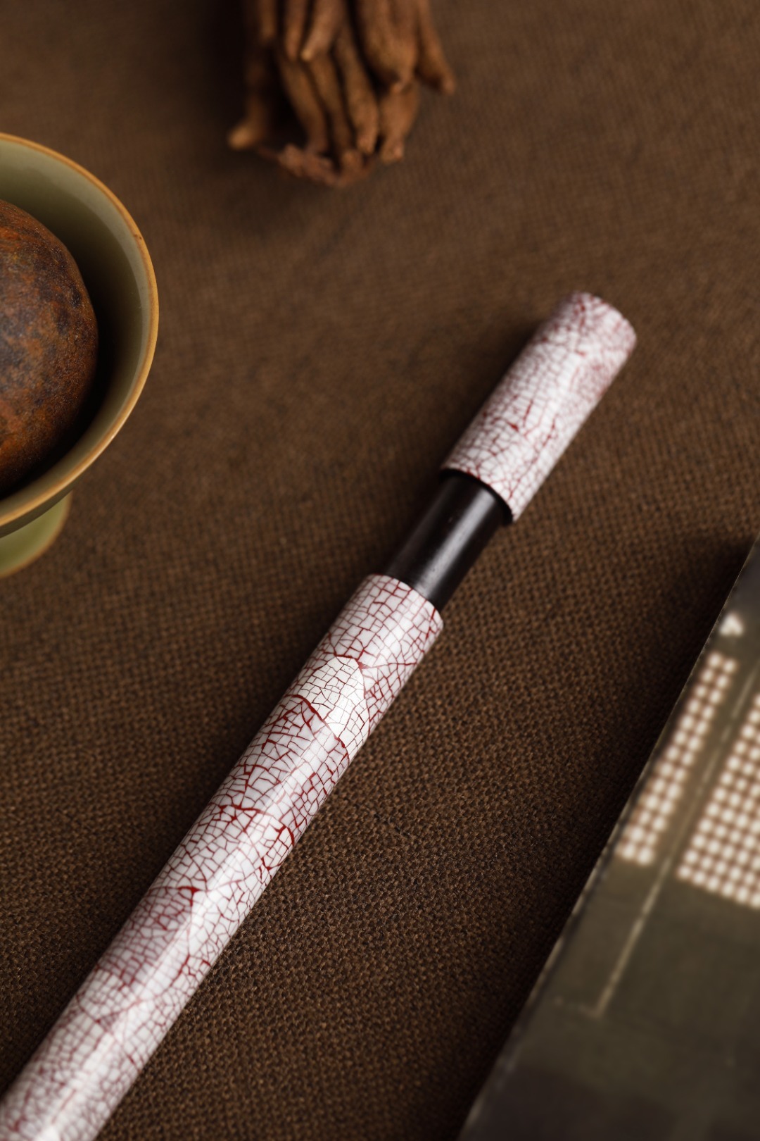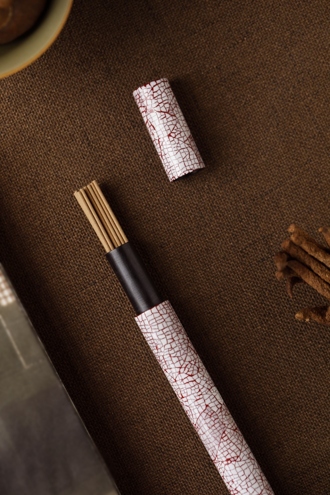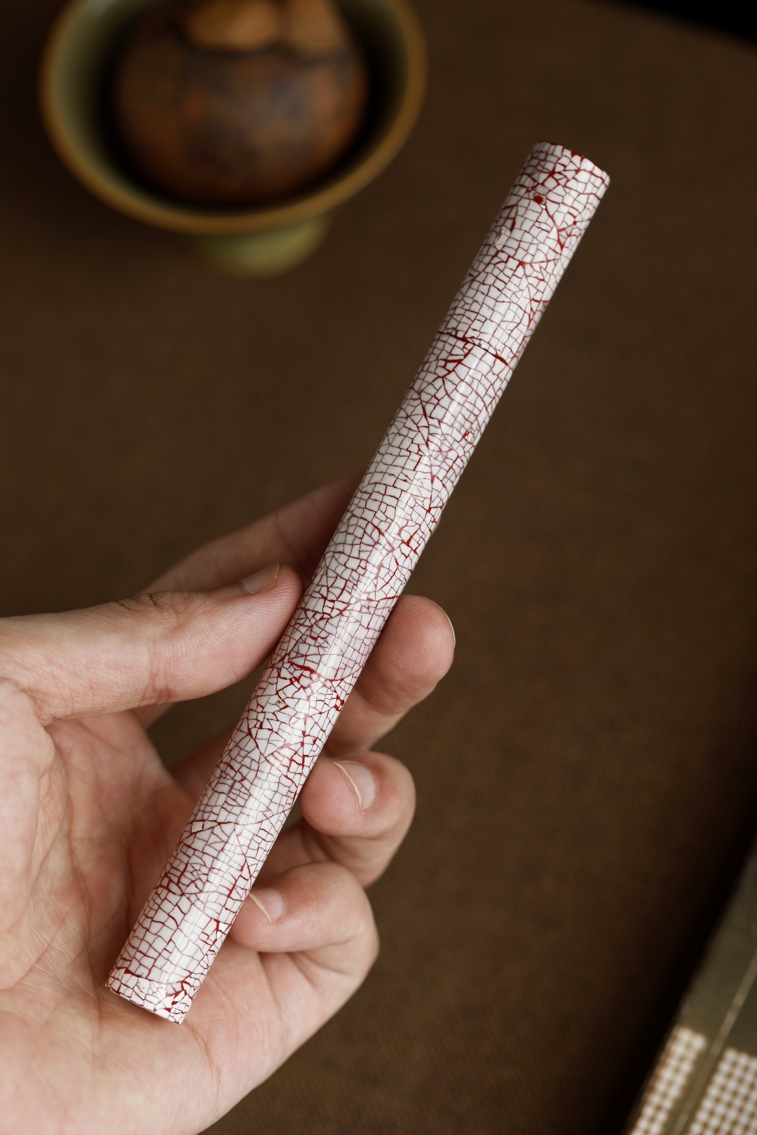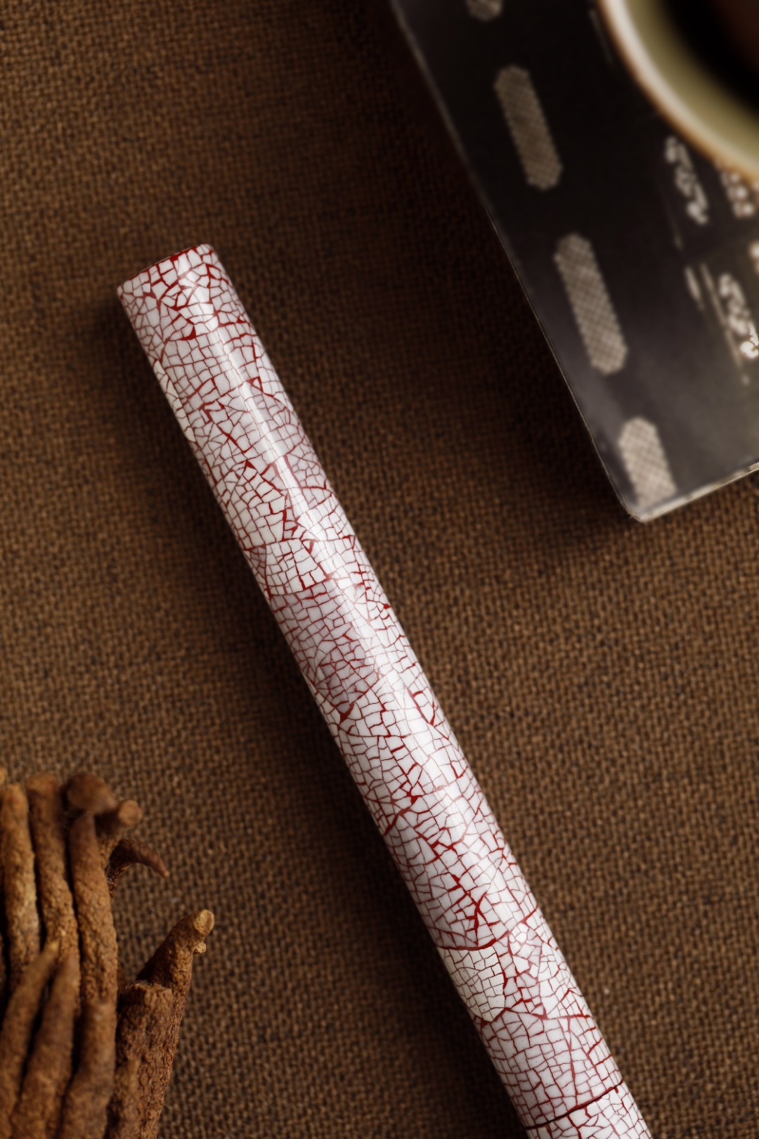 大漆x蛋壳【冰裂纹】香筒满工镶嵌蛋壳,纹如冰裂,明艳夺目,髹漆其上,色华质坚历久弥新,密封性强,利于存香,便于携带。规格:16.9*1.5 重26.7g 大漆x蛋壳【冰裂纹】香筒