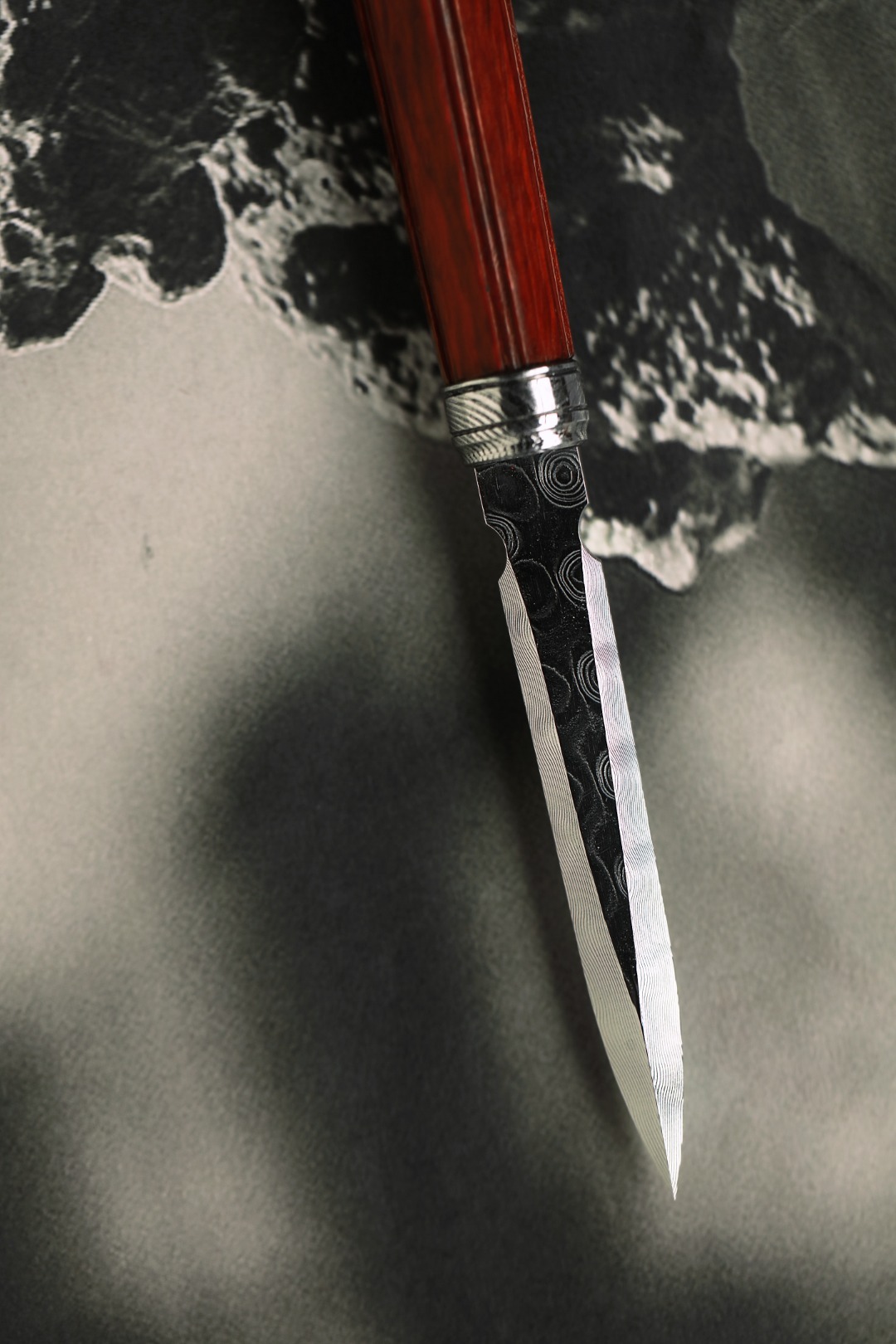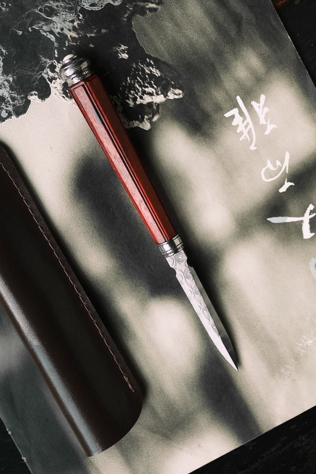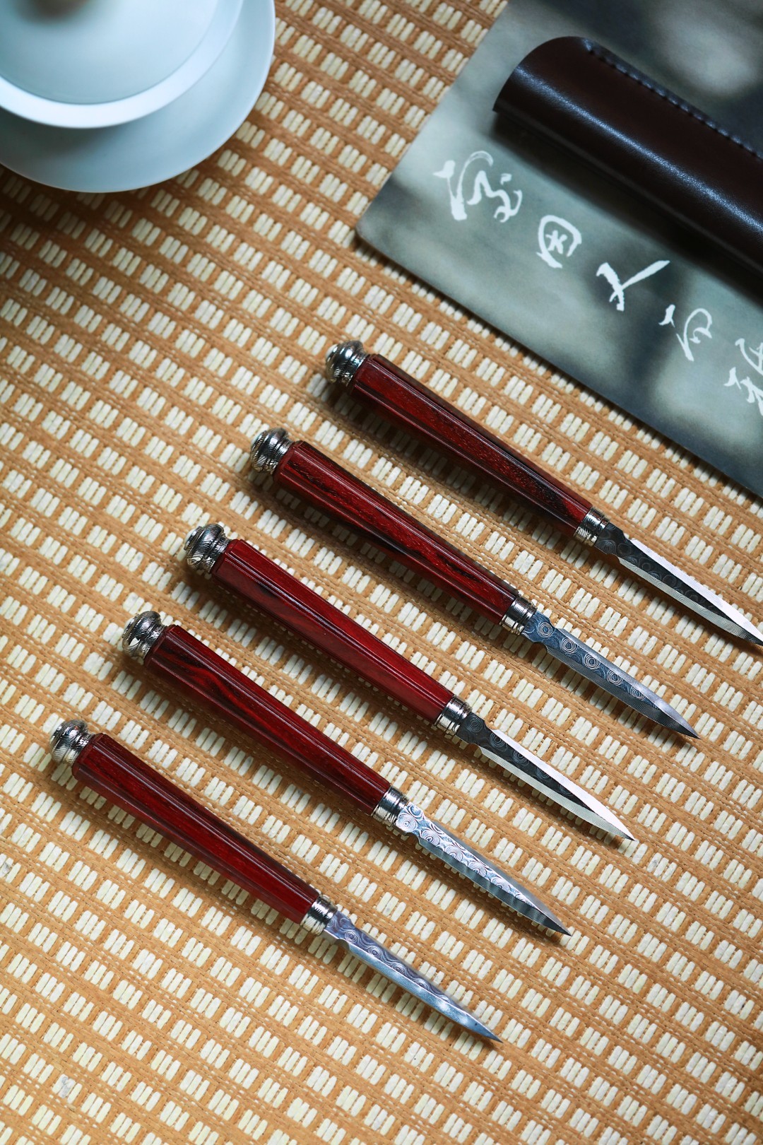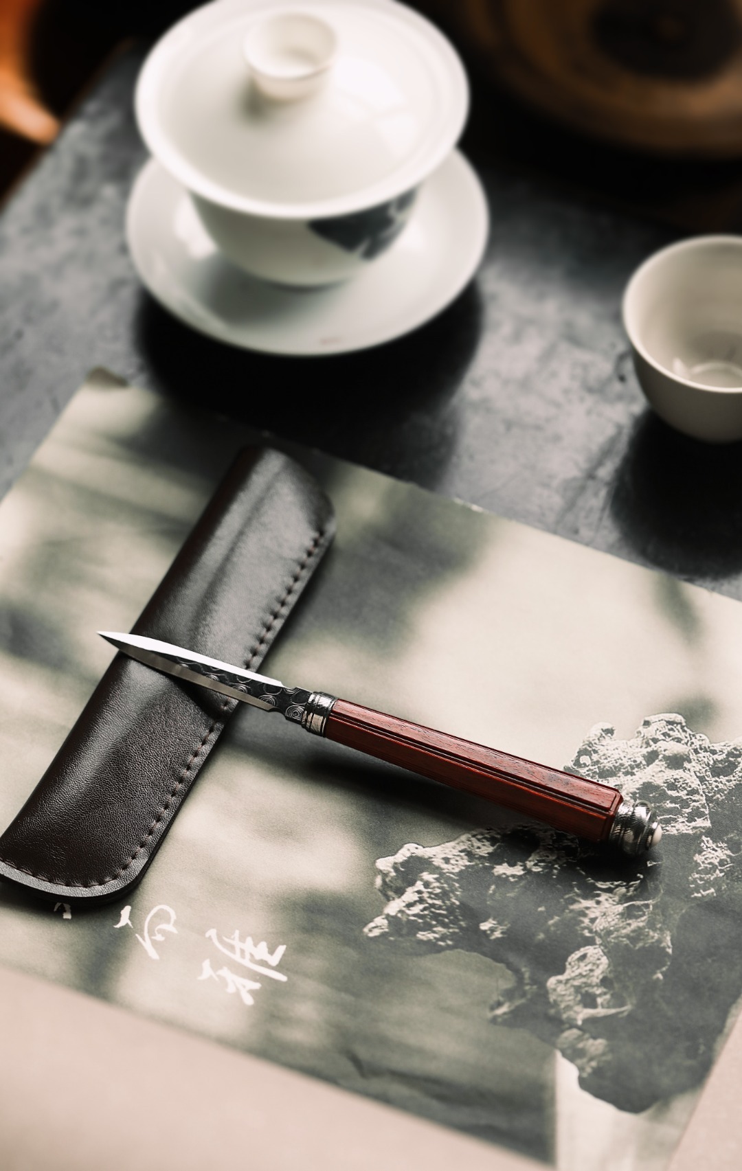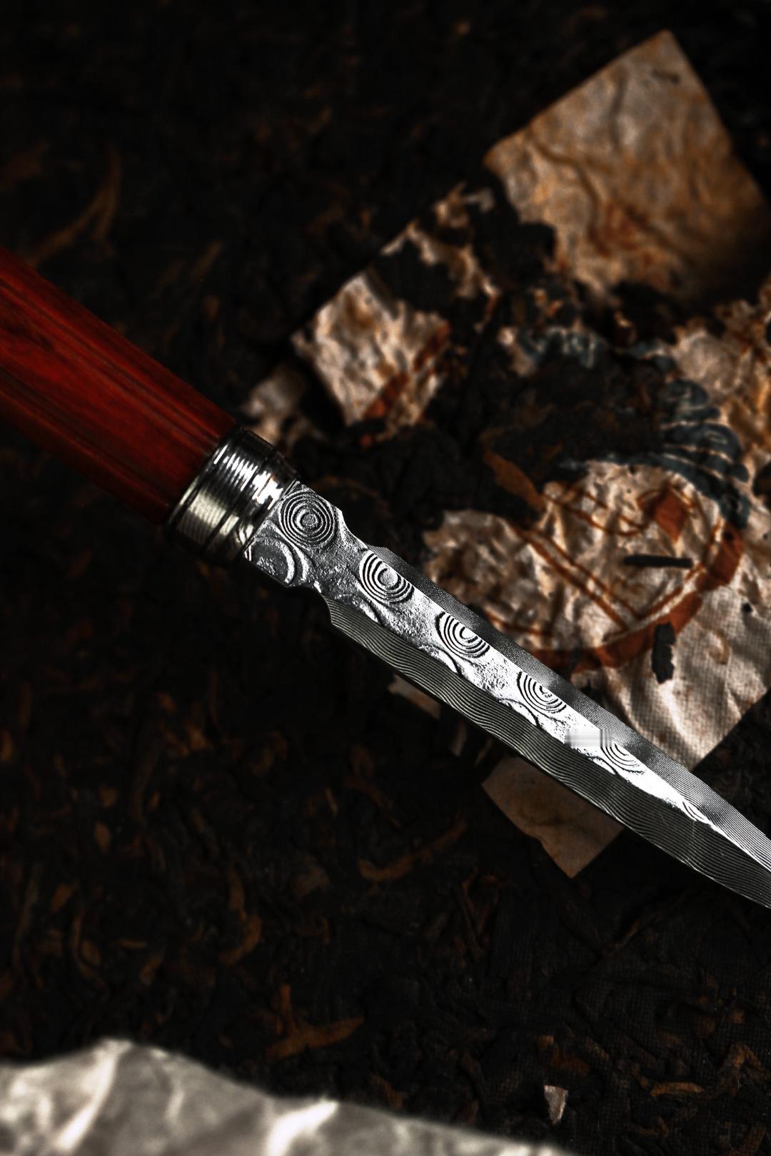 小叶紫檀 | 茶刀刀柄以小叶紫檀制,大马士革钢的独特纹理彰显锋芒,质感很好,日常