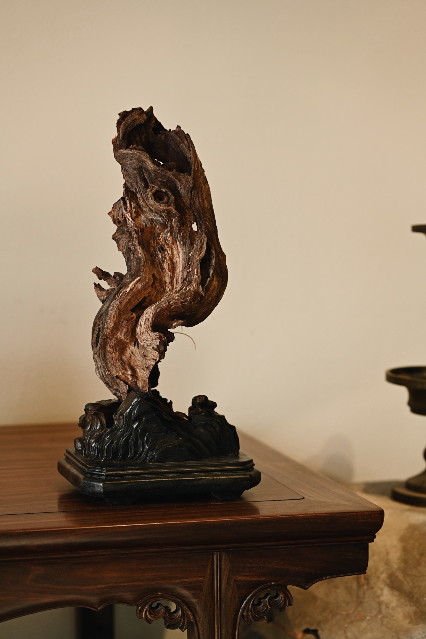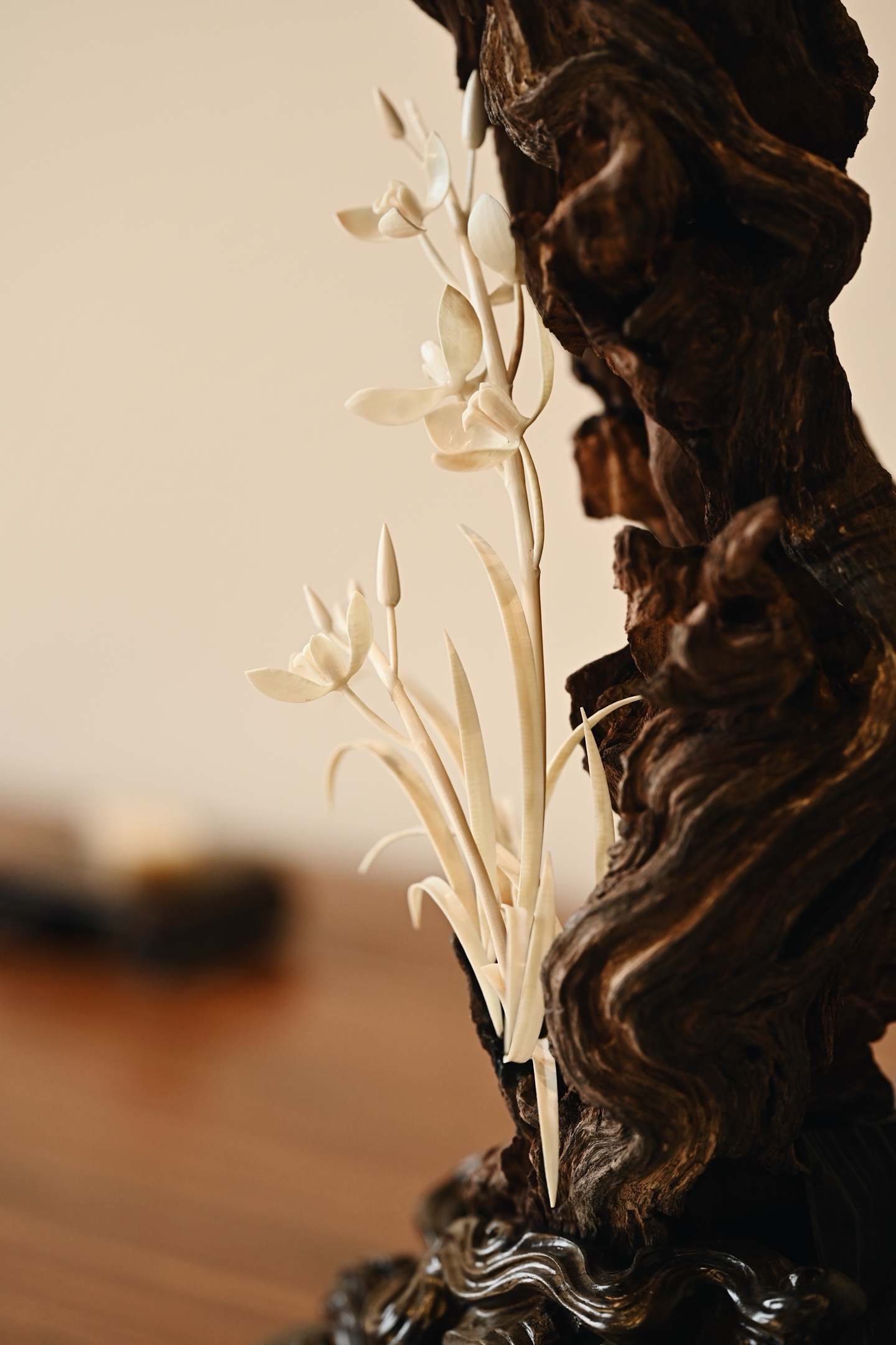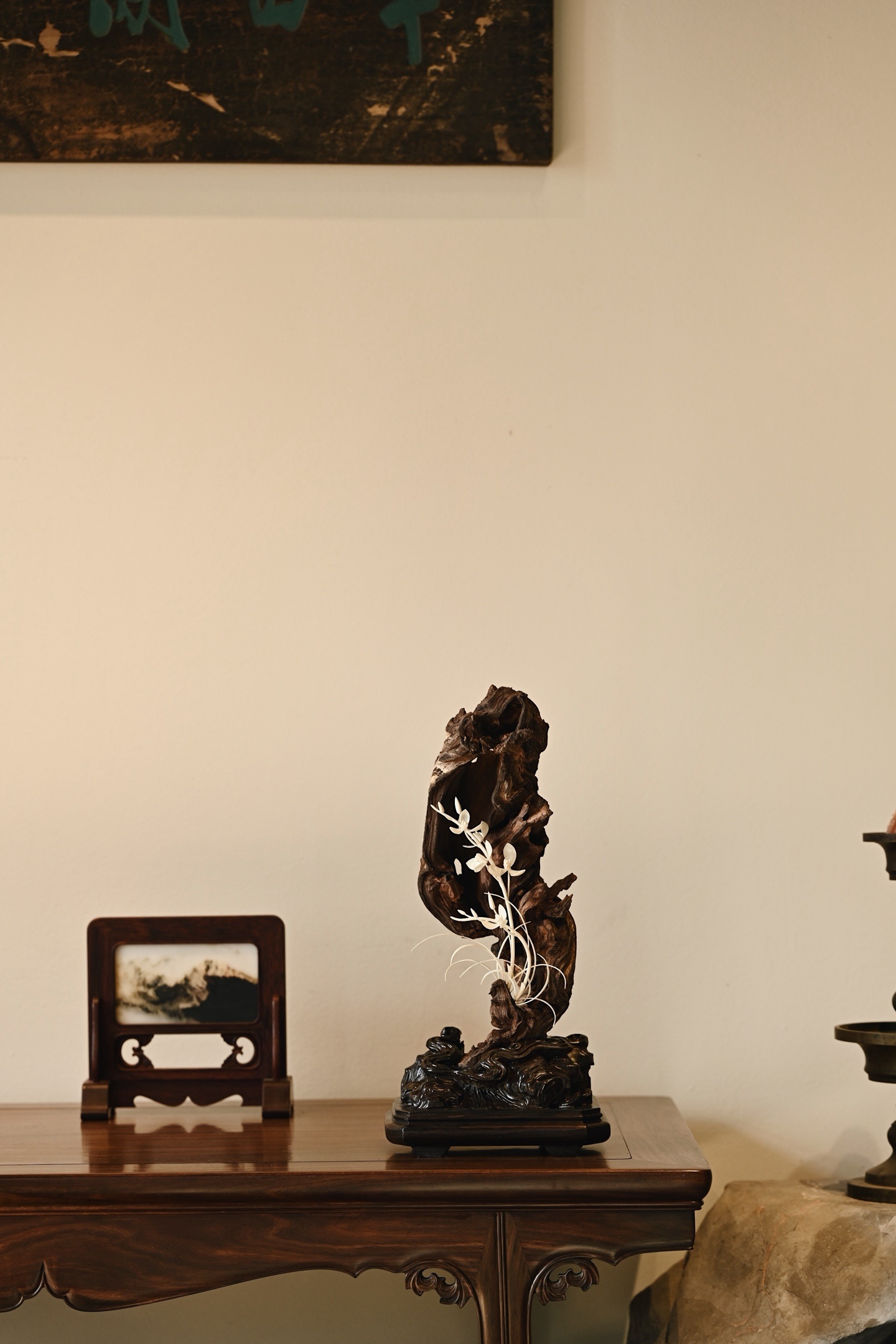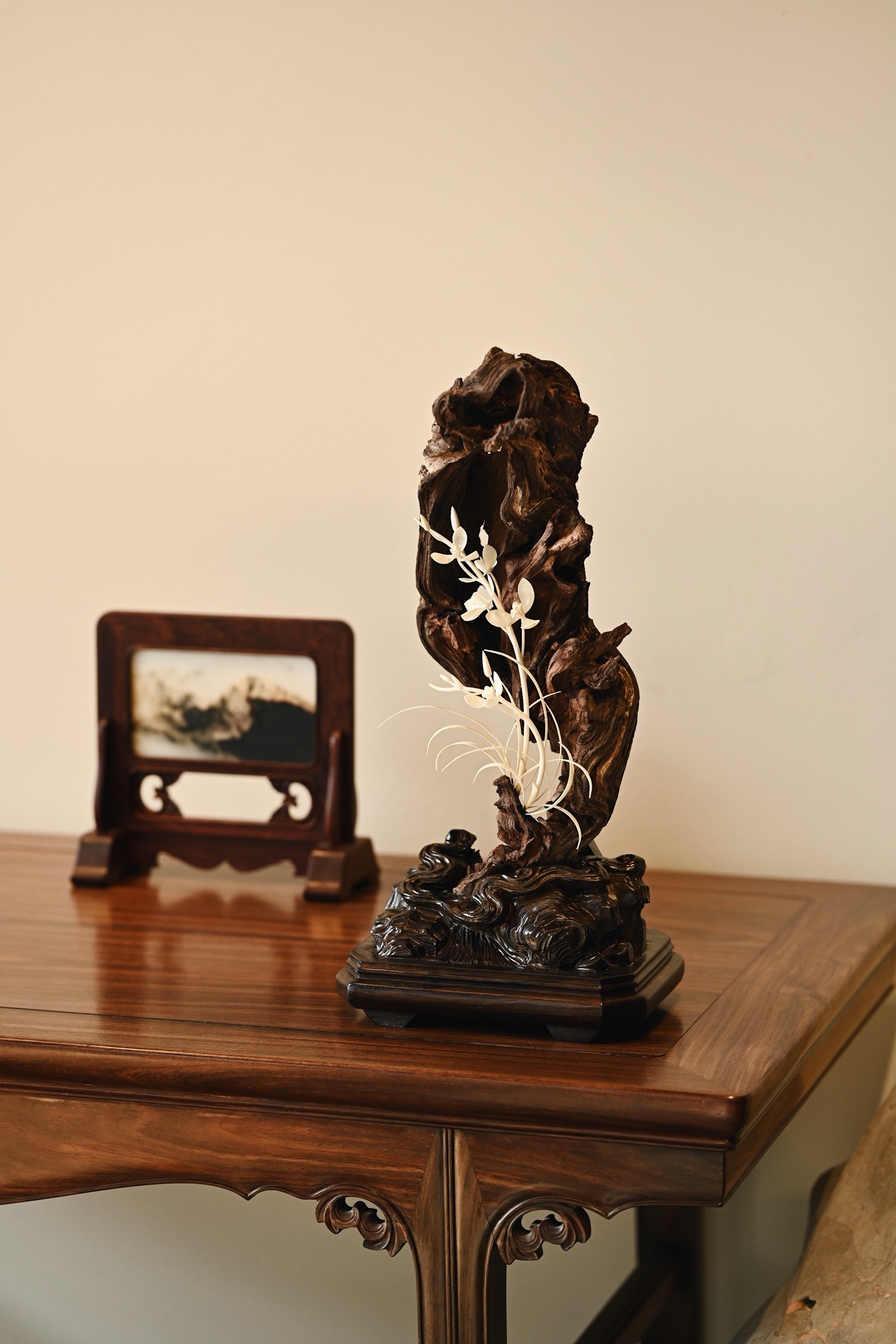 降真香x猛犸 | 风兰舞幽香 摆件取其自然之形,沉稳中不失灵动之势,嵌猛犸兰花,花叶玲珑,兰草随风,布局空灵,与石相衬,文雅非凡。18*16*38.5cm 2034g