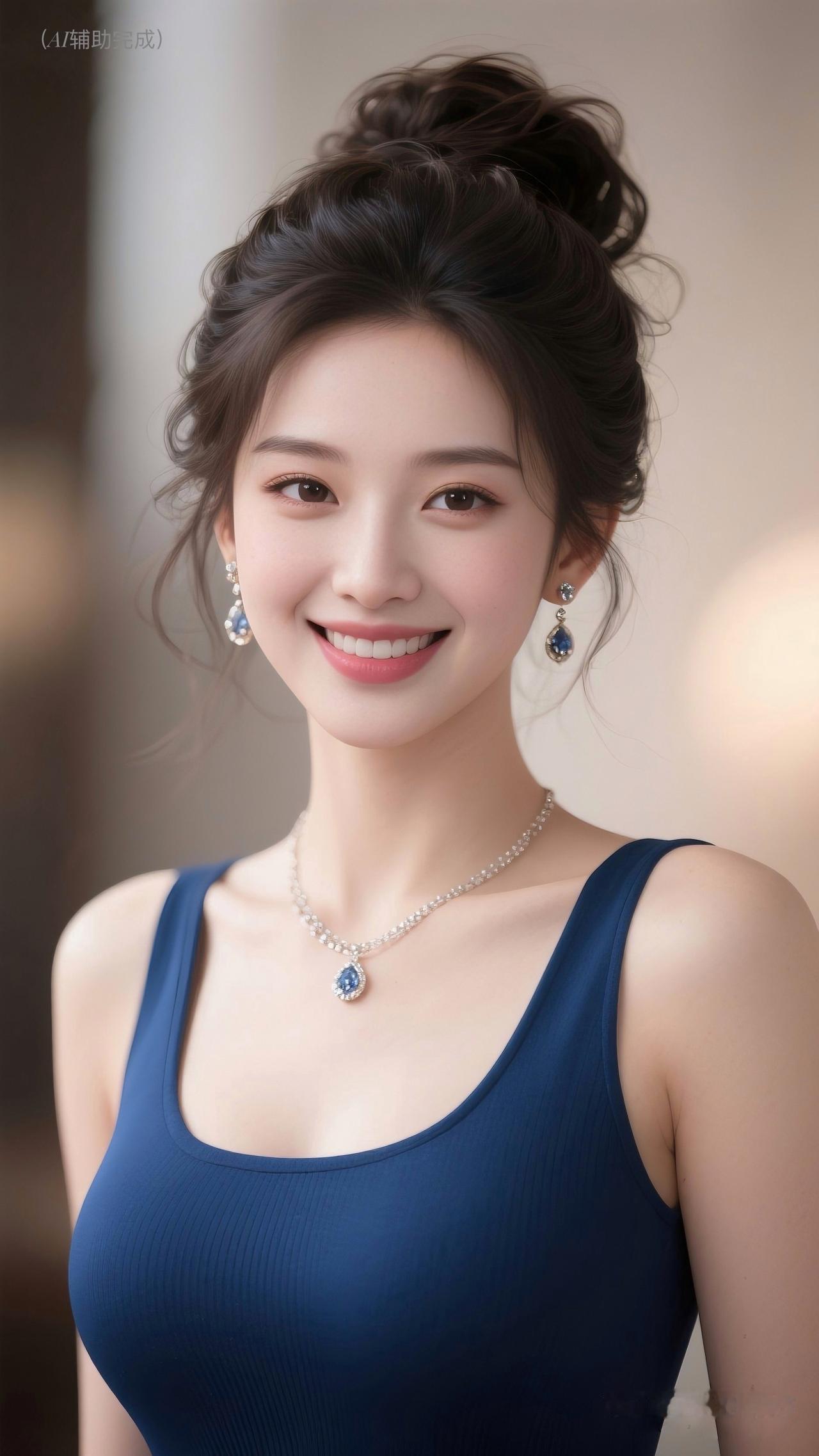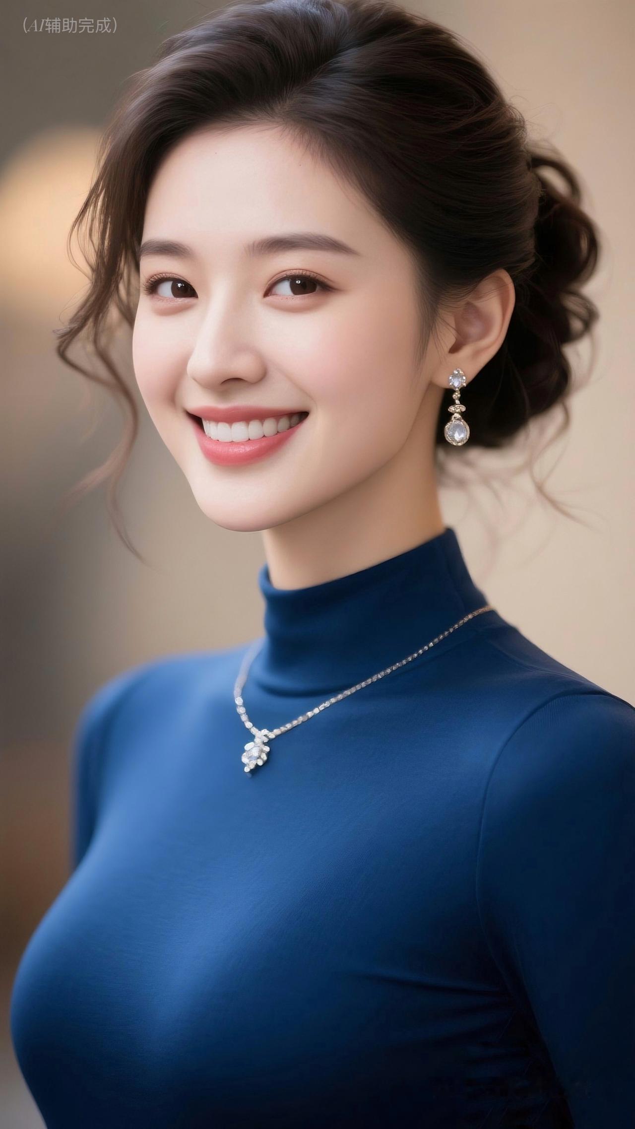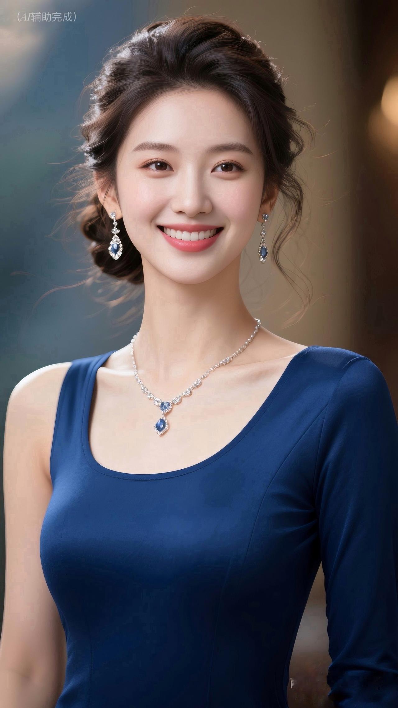 深蓝衣裹温婉,盘发垂碎发添柔。蓝宝钻石耳坠项链映眸,眉眼弯弯笑靥甜,眼神亮如星。