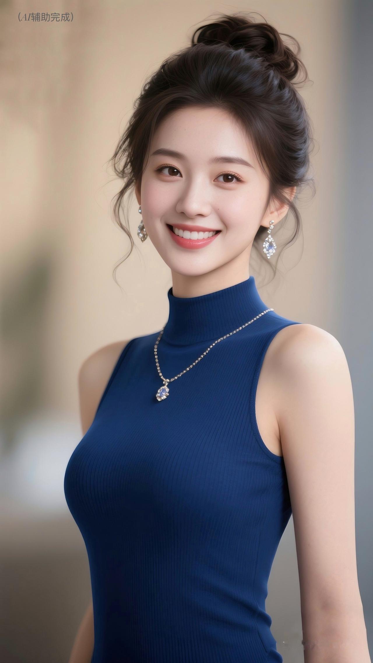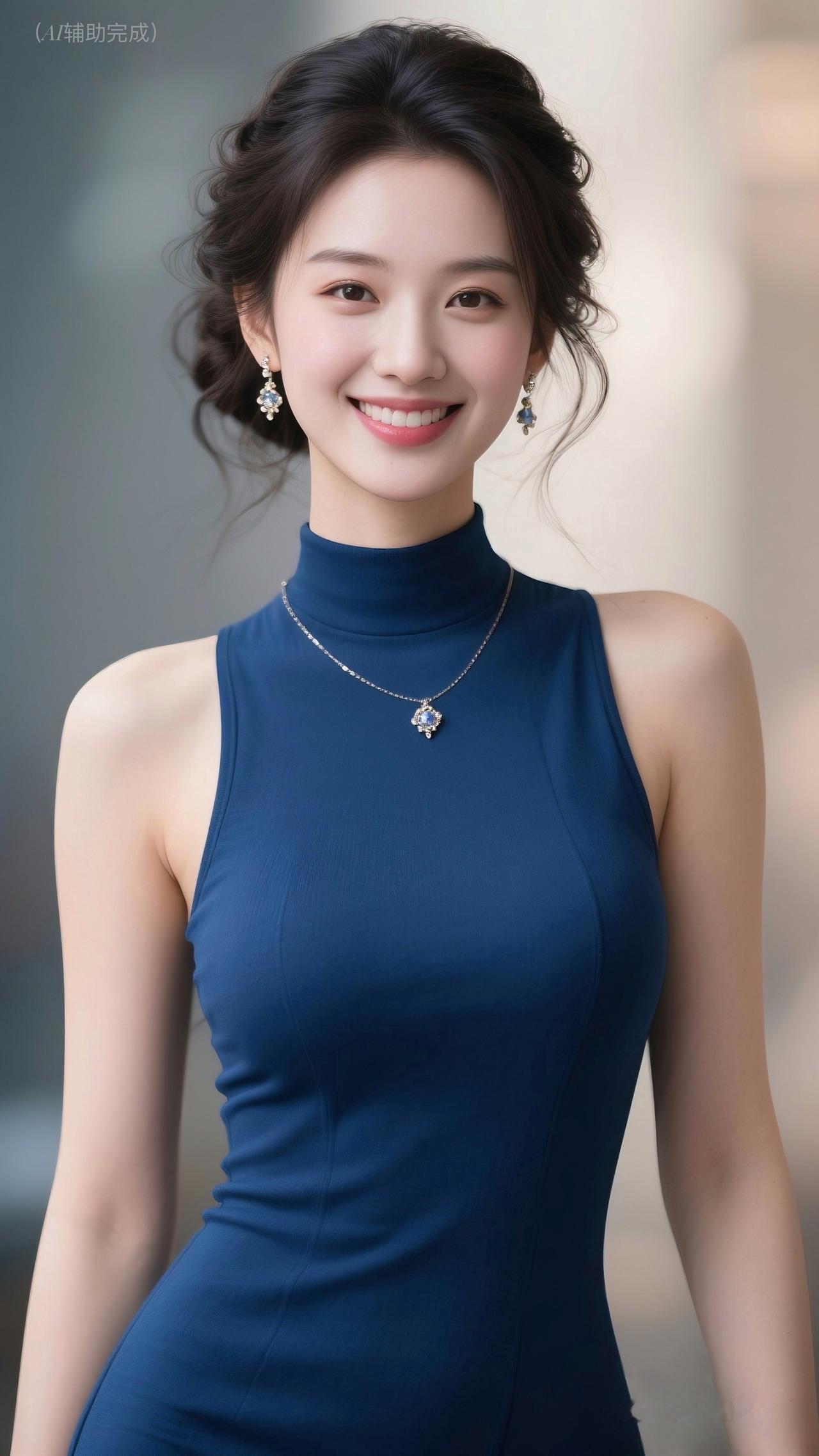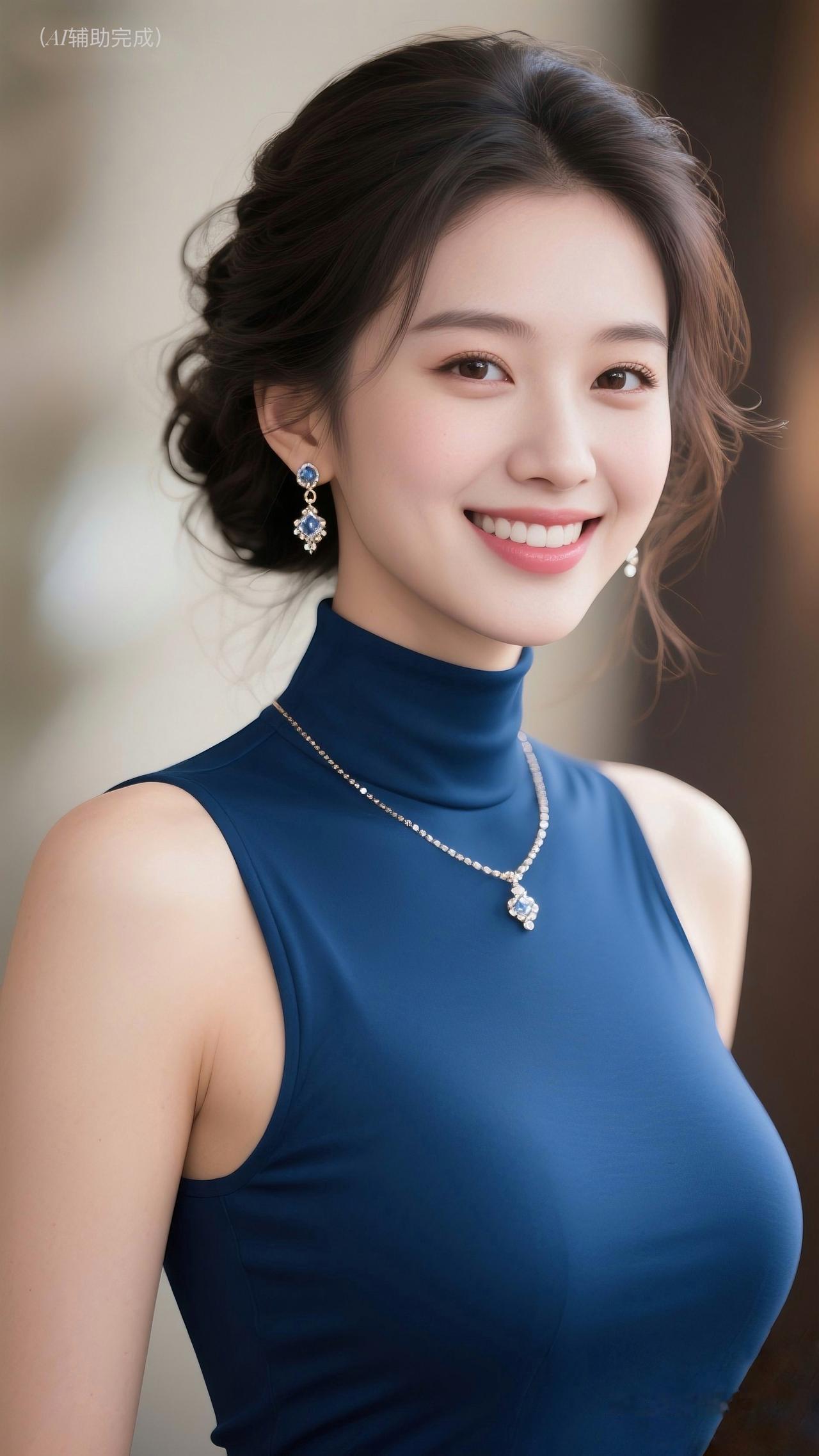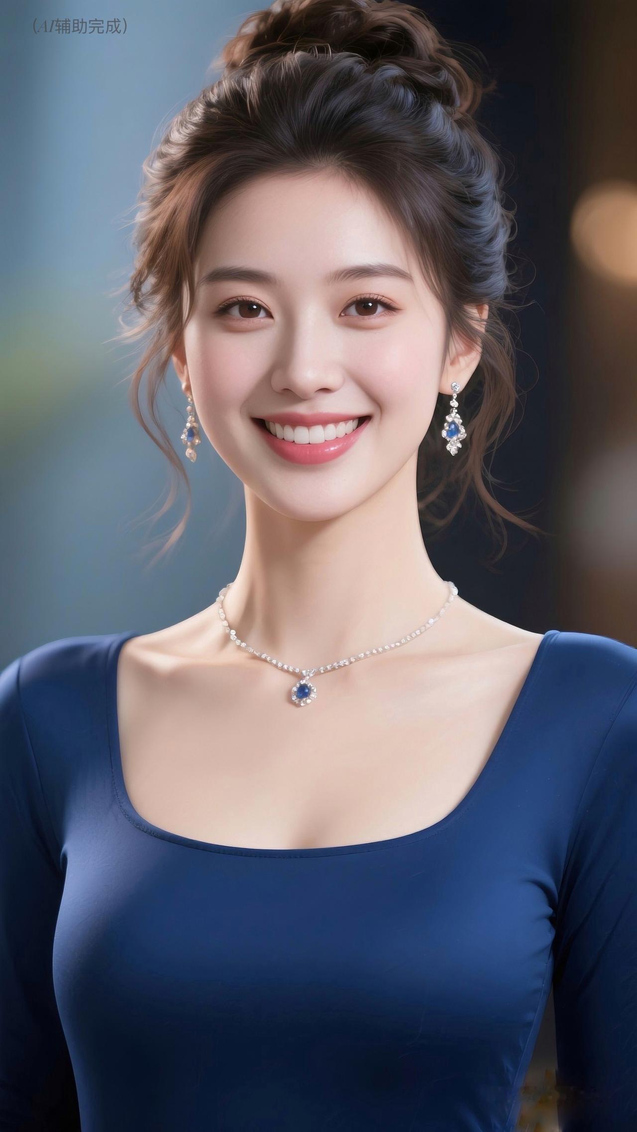 深蓝衣裹温婉,盘发垂碎发添柔。蓝宝钻石耳坠项链映眸,眉眼弯弯笑靥甜,眼神亮如星。