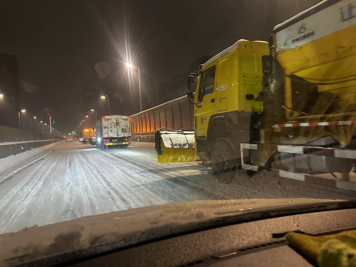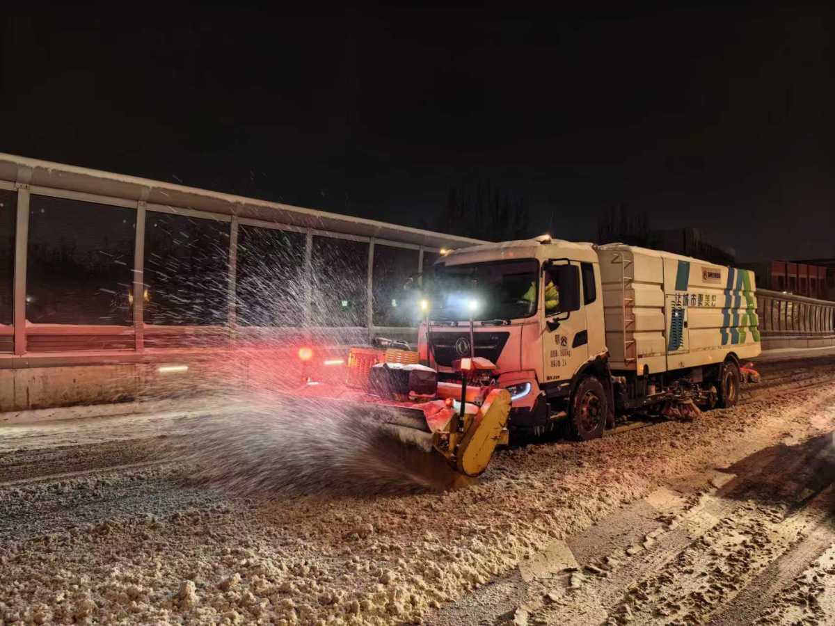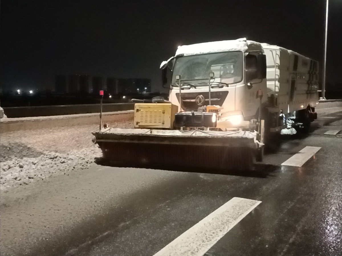 机械主力高效作业:112台撒布机、110台雪辊车组成“先锋部队”,在高架主干道以“边下边清、循环作业”方式,对桥面进行全面破冰与融雪剂撒布,防止路面二次结冰。