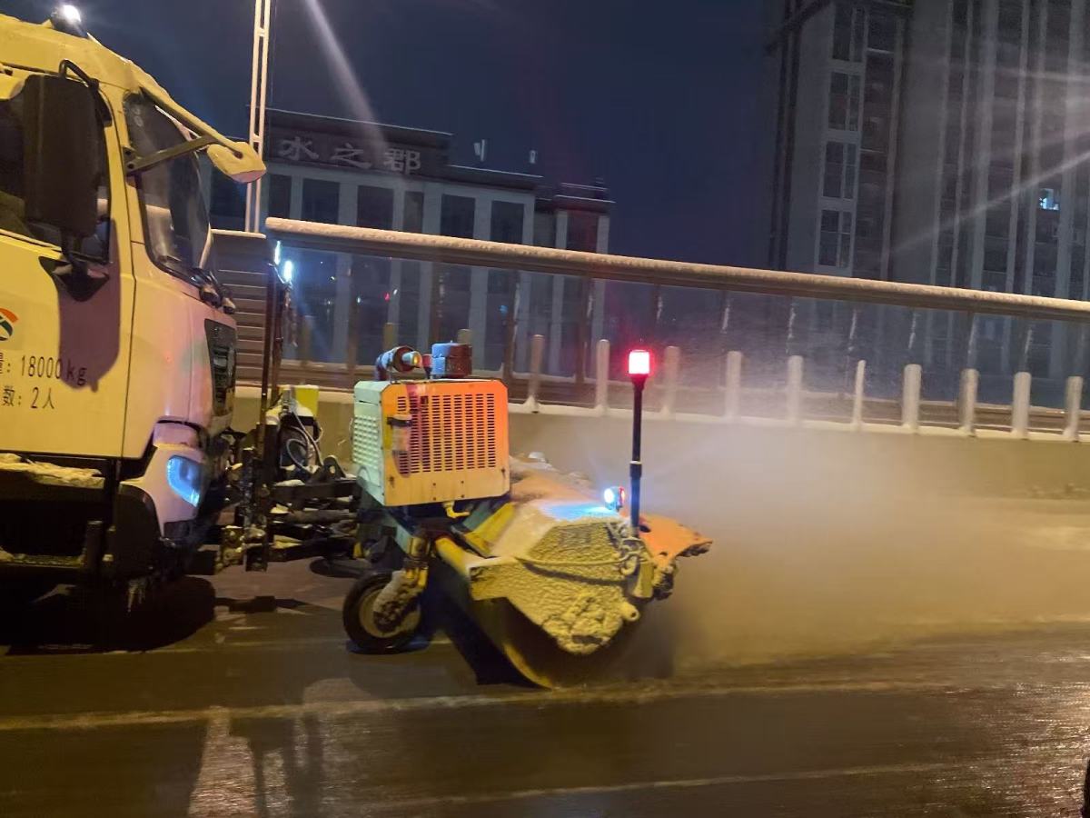 寒夜中,高架快速路上机械轰鸣,灯火通明。郑州市环卫中心各作业单位采用“机械开路、融雪辅助、人工攻坚”的作业模式,构建起高效的除冰除雪钢铁矩阵。