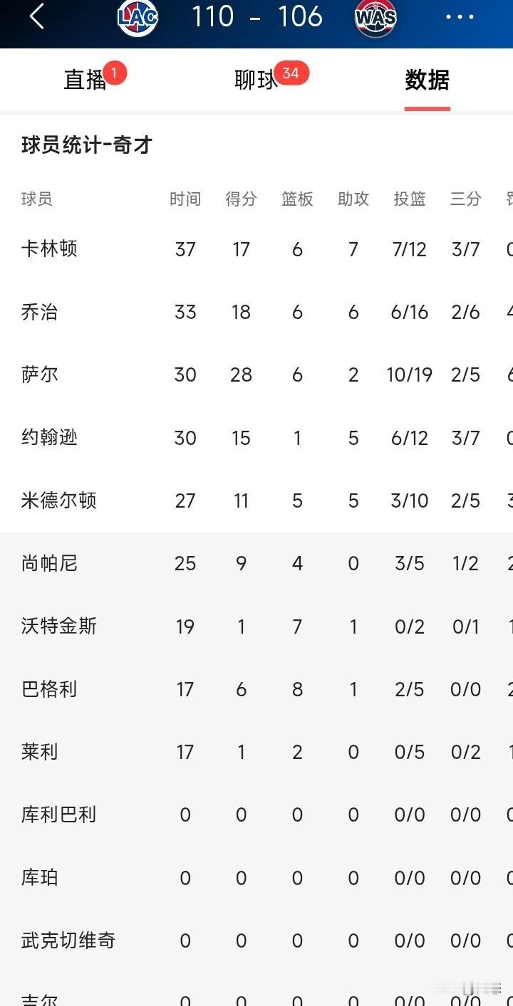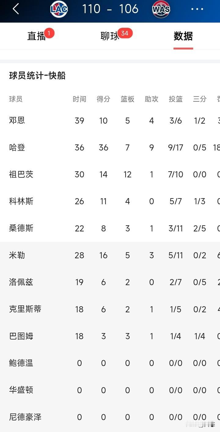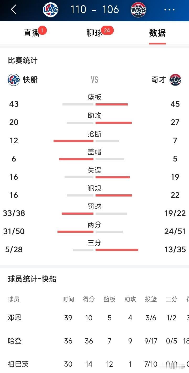 洛杉矶快船客场挑战华盛顿奇才,快船有惊无险110比106奇才,惊险过关。 快船赢球的最大功臣非哈莫属,哈登17中9,罚球20中18,外加7个篮板,9个助攻,在全场包夹的情况下还能打出数据,不得不说哈登非常厉害。和火箭登有得一比。 替补给力一点,比赛可能早就花了。有人说哈登靠碰瓷赢下比赛,裁判是哈登亲戚吗? 哈登今天三分失准,中投命中率非常高,12中9。 希望快船继续前进,从倒数第一杀入附加赛,非常不容易。 你们觉得快船最终排名多少呢?