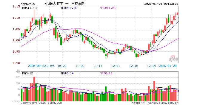 1月20日,机器人ETF(562500)开盘涨0.00%,报1.112元。机器人ETF(562500)重仓股方面,汇川技术开盘跌0.32%,科大讯飞涨0.74%,石头科技跌0.13%,大华股份涨0.15%,中控技术涨1.66%,大族激光跌0.25%,双环传动涨0.32%,科沃斯跌0.08%,机器人跌0.22%,云天励飞涨0.90%。