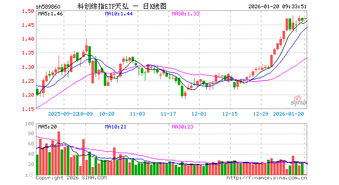 1月20日,科创综指ETF天弘(589860)开盘涨0.34%,报1.468元。科创综指ETF天弘(589860)重仓股方面,海光信息开盘涨1.97%,寒武纪跌0.19%,中芯国际跌0.23%,中微公司跌0.79%,澜起科技跌0.68%,百利天恒跌0.65%,金山办公涨0.87%,联影医疗涨0.48%,影石创新涨0.19%,传音控股跌0.35%。