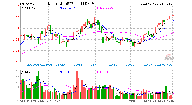 1月20日,科创板新能源ETF(588960)开盘跌0.20%,报1.506元。科创板新能源ETF(588960)重仓股方面,天合光能开盘跌1.89%,晶科能源跌0.34%,天奈科技跌0.14%,阿特斯跌0.28%,大全能源涨0.20%,厦钨新能涨0.16%,容百科技跌0.54%,孚能科技涨0.06%,聚和材料跌2.03%,嘉元科技涨0.55%。