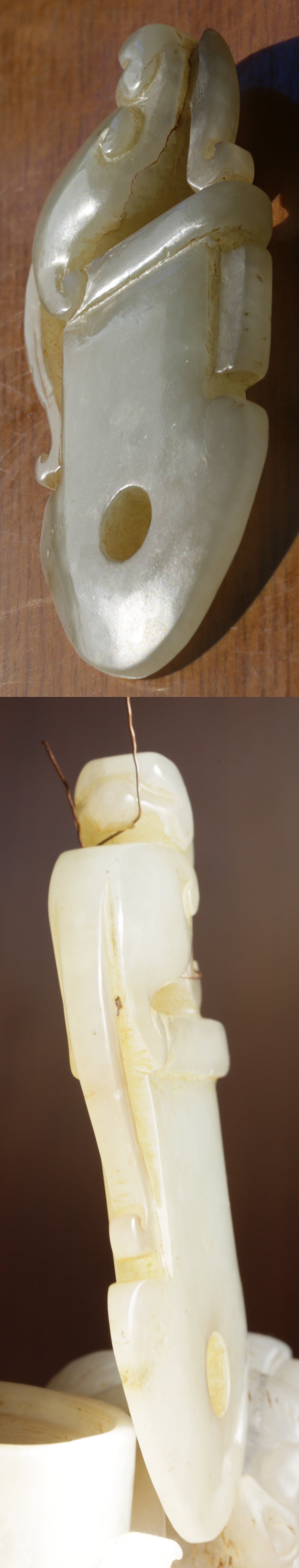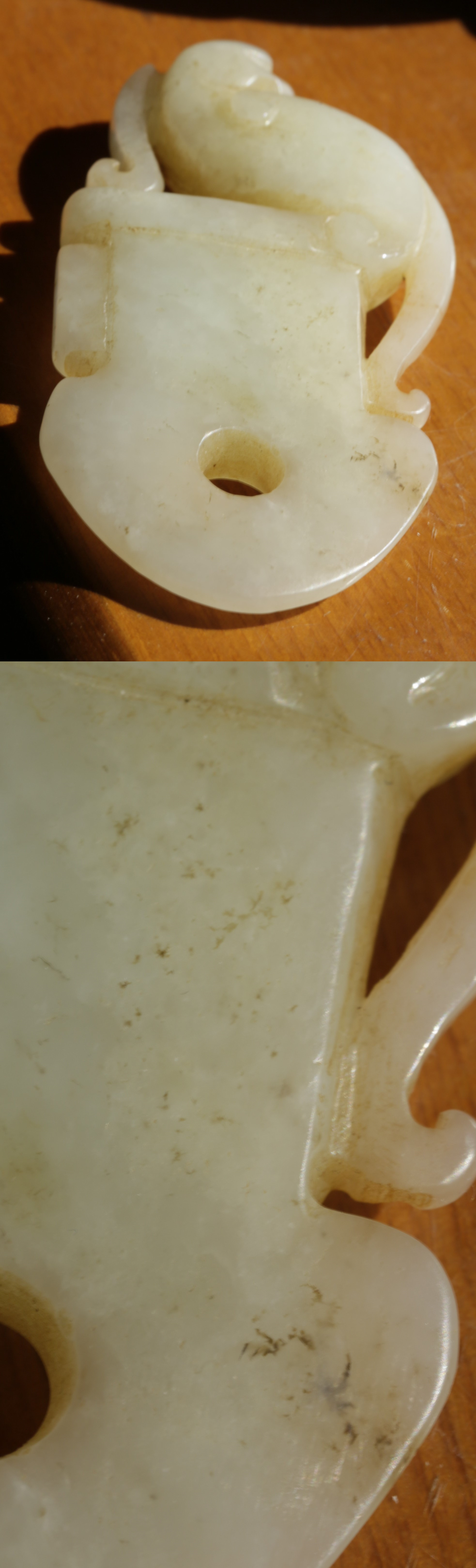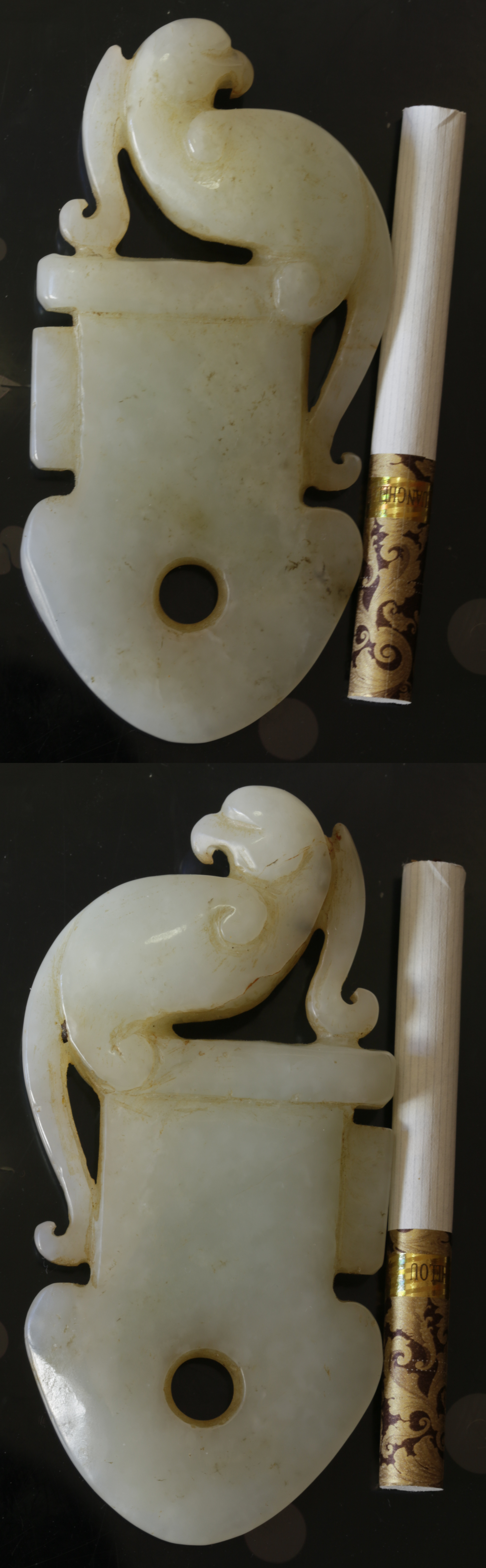 汉 . 和田玉凤钮戈形玉佩一件尺寸:重59.8克,高89MM,宽44MM,厚15MM。品相:全品。本件汉代古玉佩饰,也可以说是汉代凤钮戈形玉佩饰,款式好,玉质白,一级白玉。玉质油润浑厚、玉纯净、玉干净、玉无杂、玉无裂无绺、器型厚实敦厚圆润,玉质极润,很少有这么好的和田籽料玉质的,一般*出*土*古**玉**的玉质都很差沁重,很多红山古玉、汉代古玉都黑不溜秋的,很多馆藏红山古玉、汉代古玉也没几个好玉质的,此乃汉代古玉精品。此乃玩高古玉梦寐之器。此玉包老。该汉代古玉佩,白玉材质通透,纹饰协调连贯,凤形立体笔挺,显贵族气息。品相完好,为上好佳品。瑞兽凤头部尖嘴宽额,两眼圆睁,雕刻灵动,古朴明丽。该玉佩玉色润和,质地细腻,造型端庄大气,雕工颇见功力。本通体抛光,带有显著的透光感,以熟练和精湛的碾磨技艺,传达自身所具古朴遒劲之神韵。又本佩大小合适,类此玉雕能历经1800年之风霜,却能保存完好,实属万中选一之杰作。工痕明显手工老工,东西非常开门,老沁似糖,注意区分,玉质非常油润,罕见。这件是新疆和田白玉籽玉雕的,保真是和田玉籽料,不是地方玉雕的,玉质很硬,能滑动玻璃。整件出廓英武斧型佩雕琢颇为精湛,角度圆润、刻划准确、琢磨精细。局部微沁、沁色自然,包浆浑厚,玉质很白,沁有些发黄,款式好,玉质级温润,多和此物交流多盘,玉质更润,是古代新疆和田老坑籽料老工雕琢而成,注意有的照片玉后有香烟对比白度,玉内结构内有沁黑沙点,这件是开门高古玉出廓英武斧型佩,是佩器。这件高古白玉玉觽厚实、美非常漂亮。盘养出来更漂亮。照片两面都照了,细心买家注意看玉表区分正反两面。包真和田玉,本玉可出和田玉证书。