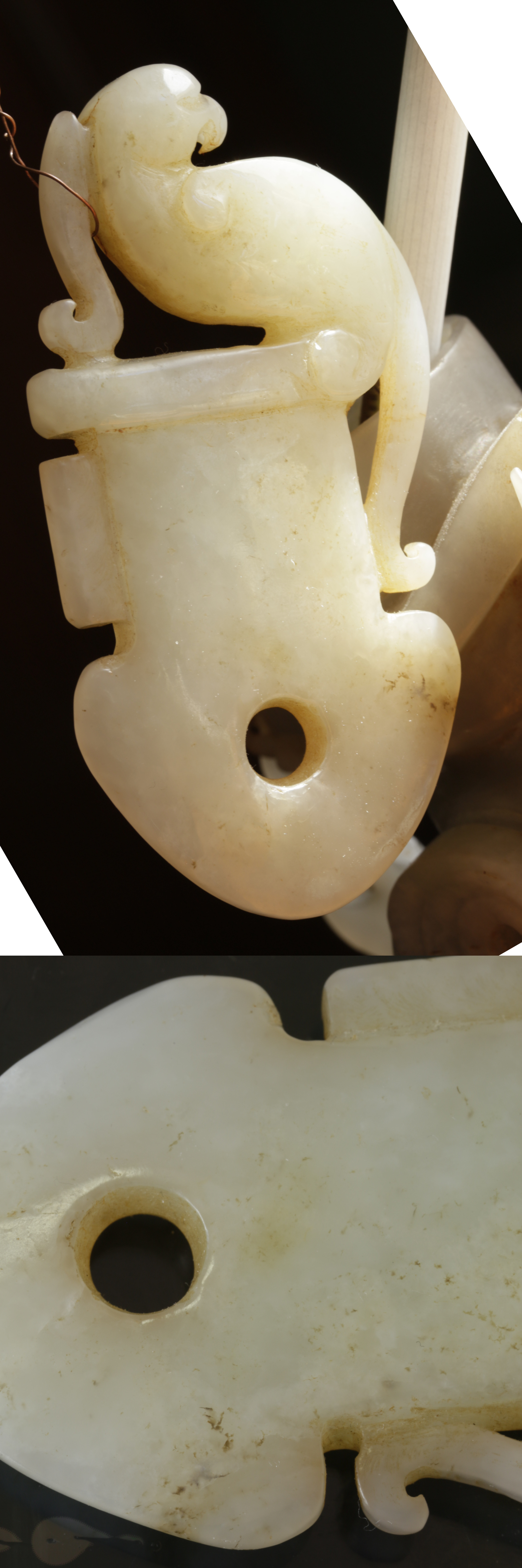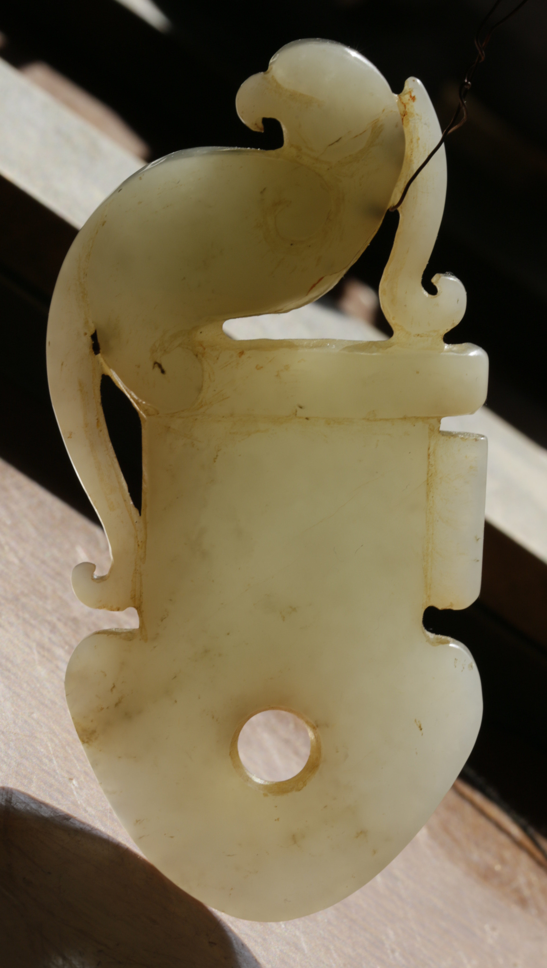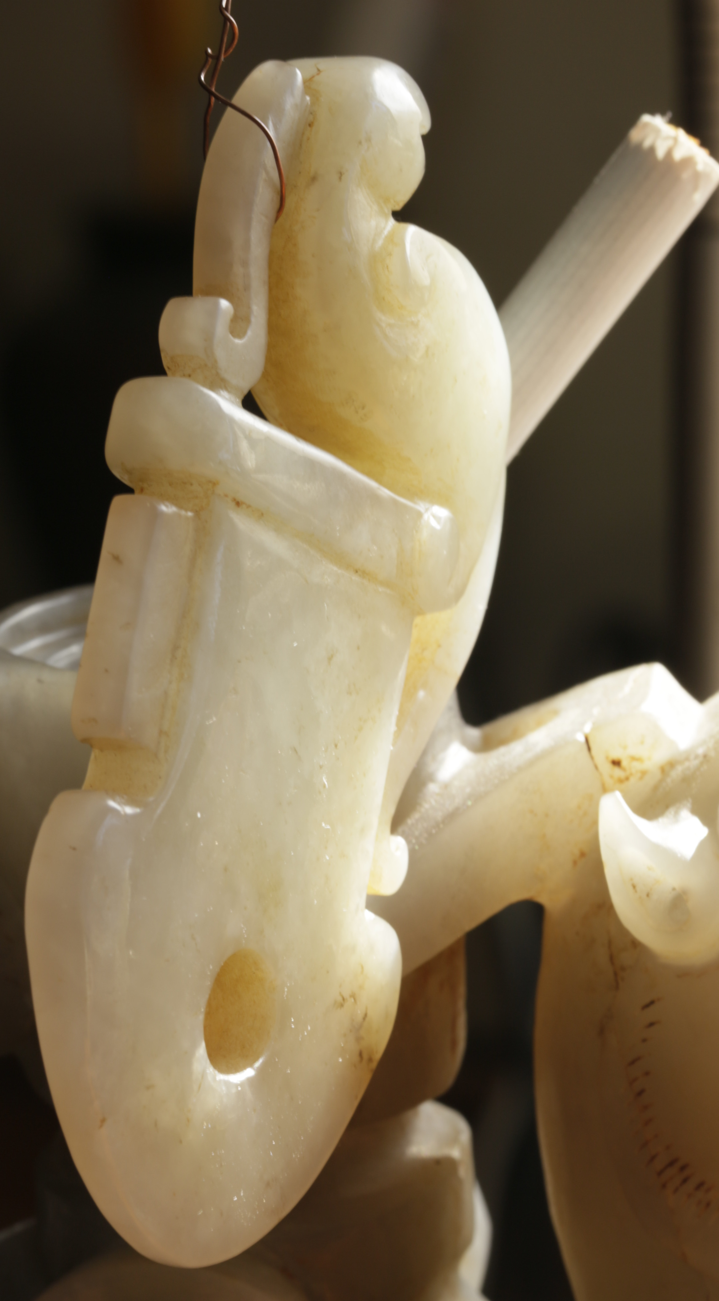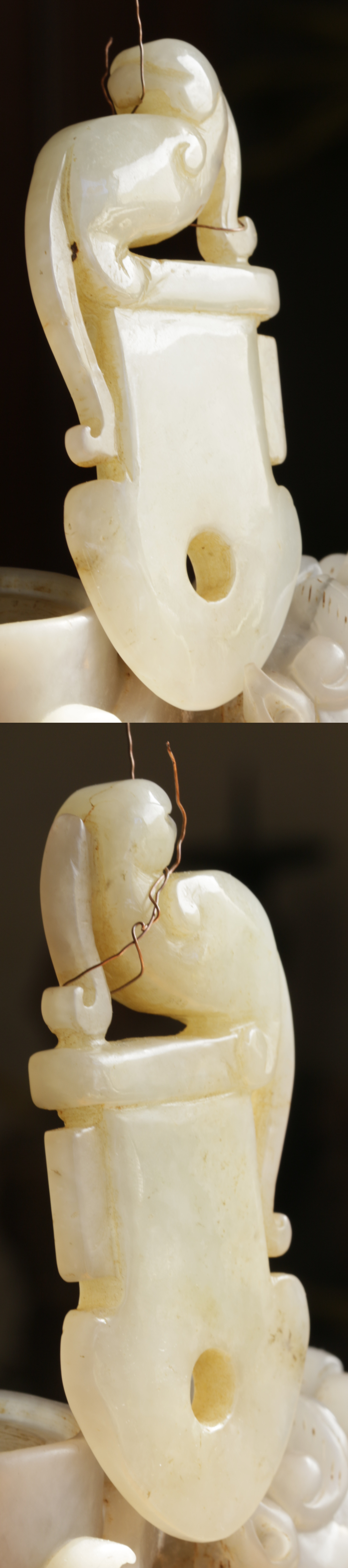 汉 . 和田玉凤钮戈形玉佩一件尺寸:重59.8克,高89MM,宽44MM,厚15MM。品相:全品。本件汉代古玉佩饰,也可以说是汉代凤钮戈形玉佩饰,款式好,玉质白,一级白玉。玉质油润浑厚、玉纯净、玉干净、玉无杂、玉无裂无绺、器型厚实敦厚圆润,玉质极润,很少有这么好的和田籽料玉质的,一般*出*土*古**玉**的玉质都很差沁重,很多红山古玉、汉代古玉都黑不溜秋的,很多馆藏红山古玉、汉代古玉也没几个好玉质的,此乃汉代古玉精品。此乃玩高古玉梦寐之器。此玉包老。该汉代古玉佩,白玉材质通透,纹饰协调连贯,凤形立体笔挺,显贵族气息。品相完好,为上好佳品。瑞兽凤头部尖嘴宽额,两眼圆睁,雕刻灵动,古朴明丽。该玉佩玉色润和,质地细腻,造型端庄大气,雕工颇见功力。本通体抛光,带有显著的透光感,以熟练和精湛的碾磨技艺,传达自身所具古朴遒劲之神韵。又本佩大小合适,类此玉雕能历经1800年之风霜,却能保存完好,实属万中选一之杰作。工痕明显手工老工,东西非常开门,老沁似糖,注意区分,玉质非常油润,罕见。这件是新疆和田白玉籽玉雕的,保真是和田玉籽料,不是地方玉雕的,玉质很硬,能滑动玻璃。整件出廓英武斧型佩雕琢颇为精湛,角度圆润、刻划准确、琢磨精细。局部微沁、沁色自然,包浆浑厚,玉质很白,沁有些发黄,款式好,玉质级温润,多和此物交流多盘,玉质更润,是古代新疆和田老坑籽料老工雕琢而成,注意有的照片玉后有香烟对比白度,玉内结构内有沁黑沙点,这件是开门高古玉出廓英武斧型佩,是佩器。这件高古白玉玉觽厚实、美非常漂亮。盘养出来更漂亮。照片两面都照了,细心买家注意看玉表区分正反两面。包真和田玉,本玉可出和田玉证书。
