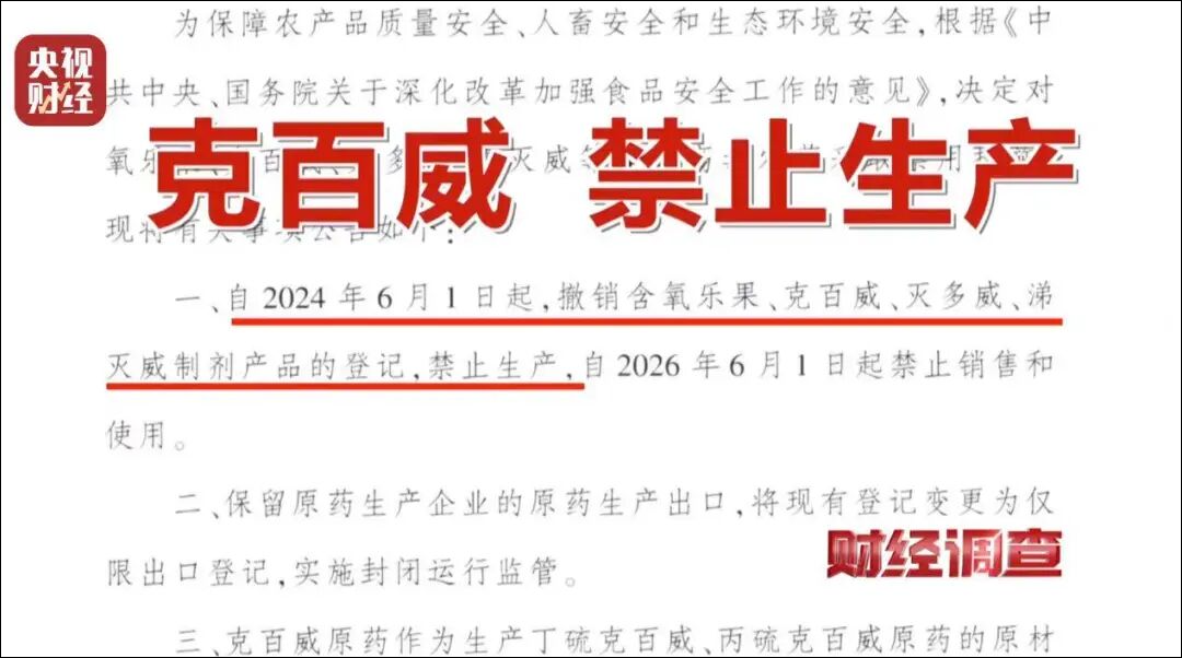 记者找到一家自称销售克百威的线下门店,销售人员告诉记者,国家从2024年6月起禁止生产克百威,今年6月起禁止销售和使用。他们售卖的所有克百威农药虽然是新生产的,但是生产日期全部写成2024年生产的,以此来逃避监管。