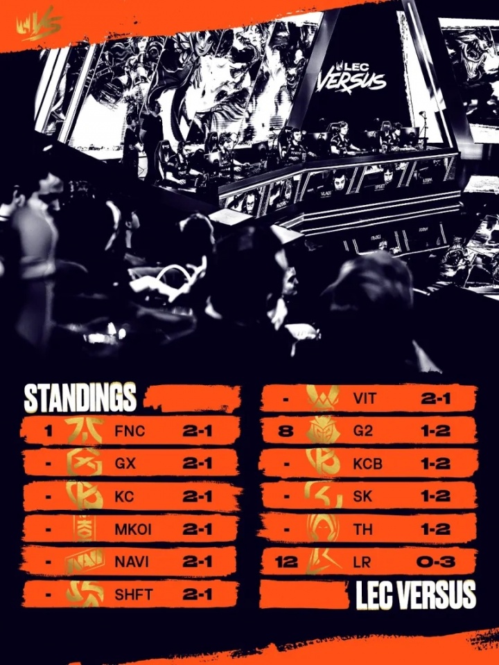 LEC首周积分榜:六队2-1并列第一;G2 1-2第七;LR 0-3垫底